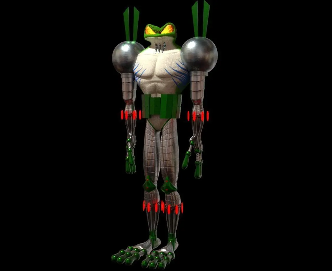 This is a low polygon model of Cyber Frog. It was modeled on maya to mantain his appearance in the comics. The model comes materials and textures in 2Kx2K in PNG format. It comes in two formats: OBJ or FBX.I made a High poly version of the body to make some muscles in the back . It comes with a basic skeleton in the FBX file to make basic poses.