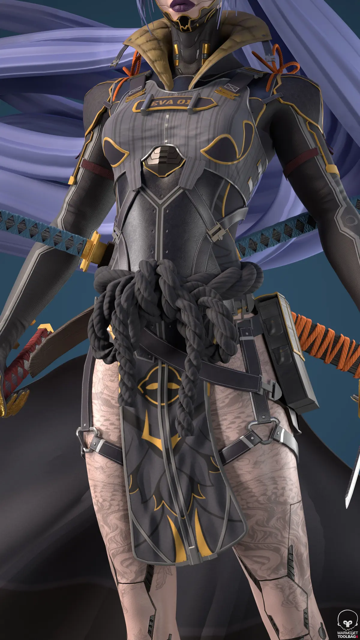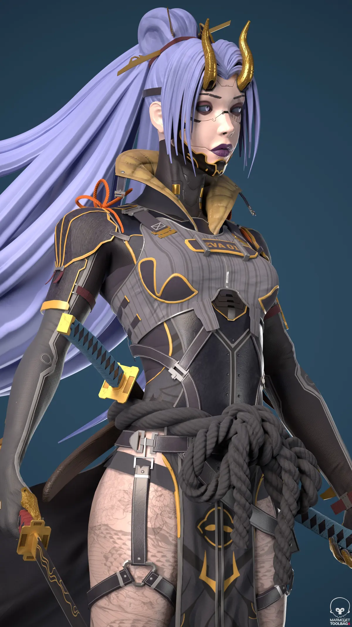 Cyberninja 3D modeled in a stylized style after a concept art made by Lee Kimsan on Pinterest.Posed female model, game ready asset including the posed obj, textures, and maya files with some basic rigging and weight painting, plus the swords and everything UV wrapped and materials named.