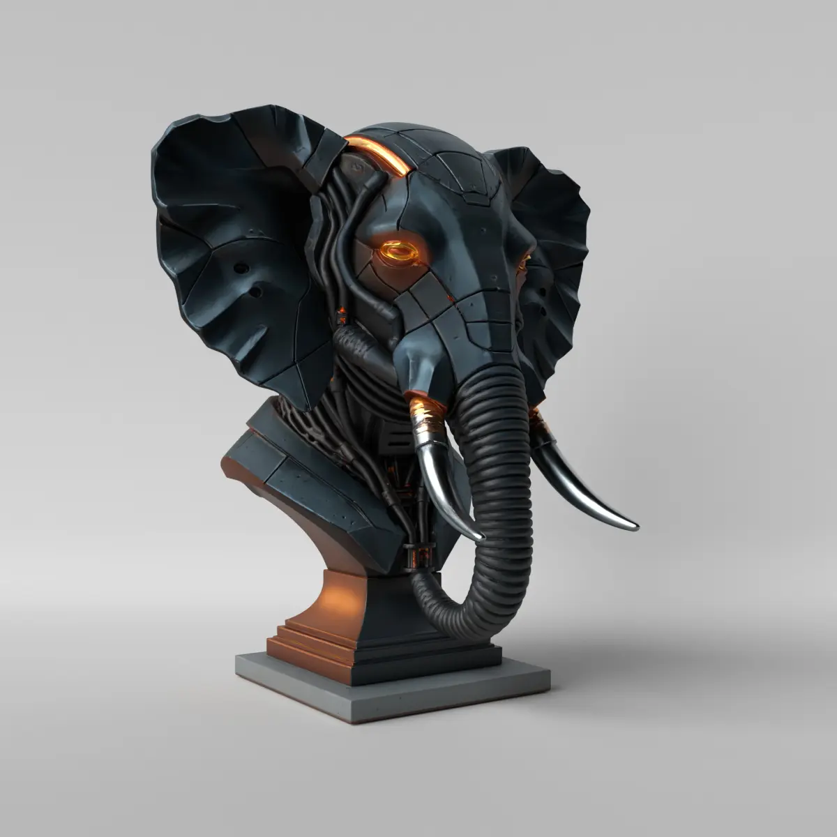 A cyberpunk-style elephant bust sculpture, combining the animal's grandeur with futuristic, neon, and tech elements. Featuring circuits, panels, tubes, lenses, and metallic textures, this bust is perfect for those who love futuristic aesthetics, digital art, and alternative decor. Ideal for studios, gamer setups, or creative spaces. Ready for 3D printing.