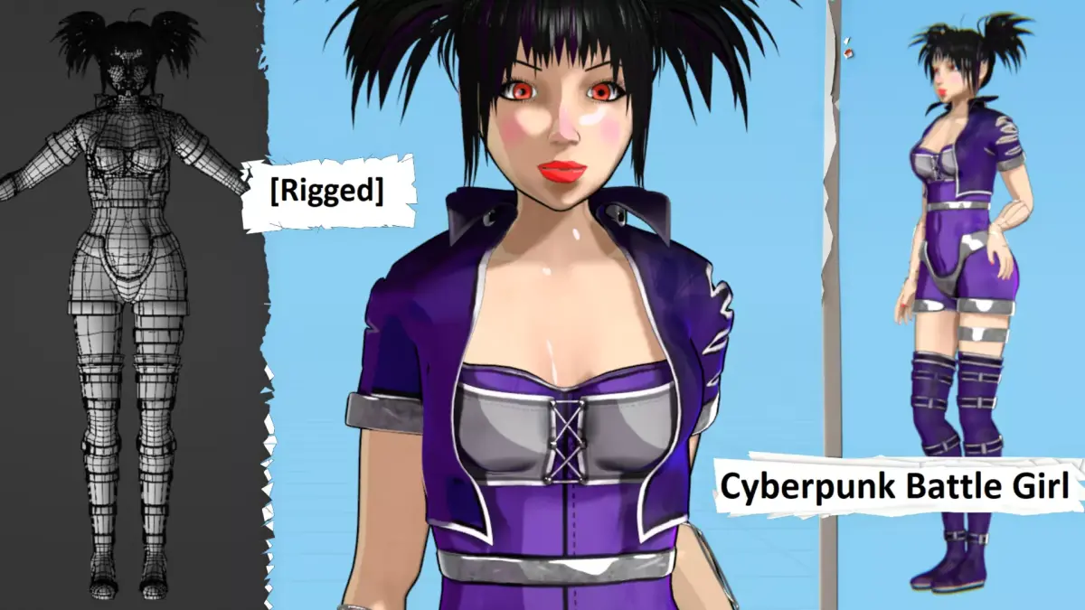 Stylized cyberpunk battle girl paired with mecha angel wings. The character, clothing, hair, and face are fully rigged, and the wings are rigged and animated. Includes a 300-frame flying/hover cycle in the .blend.