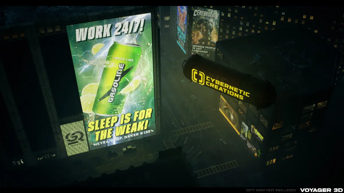 As with the previous packs, there are a large amount of unique advertisement designs. Nearly all of the designs have multiple variations to them, with changed colors, backgrounds, and effects. There are a variety of models included with this pack, in a variety of different sizes, aspect ratios and styles! There is physical billboard/ LED meshes, 2d hologram meshes and 3D voxel hologram meshes in every aspect ratio we support. Not to mention, this pack includes a futuristic advertising blimp to show your ads high in the sky!