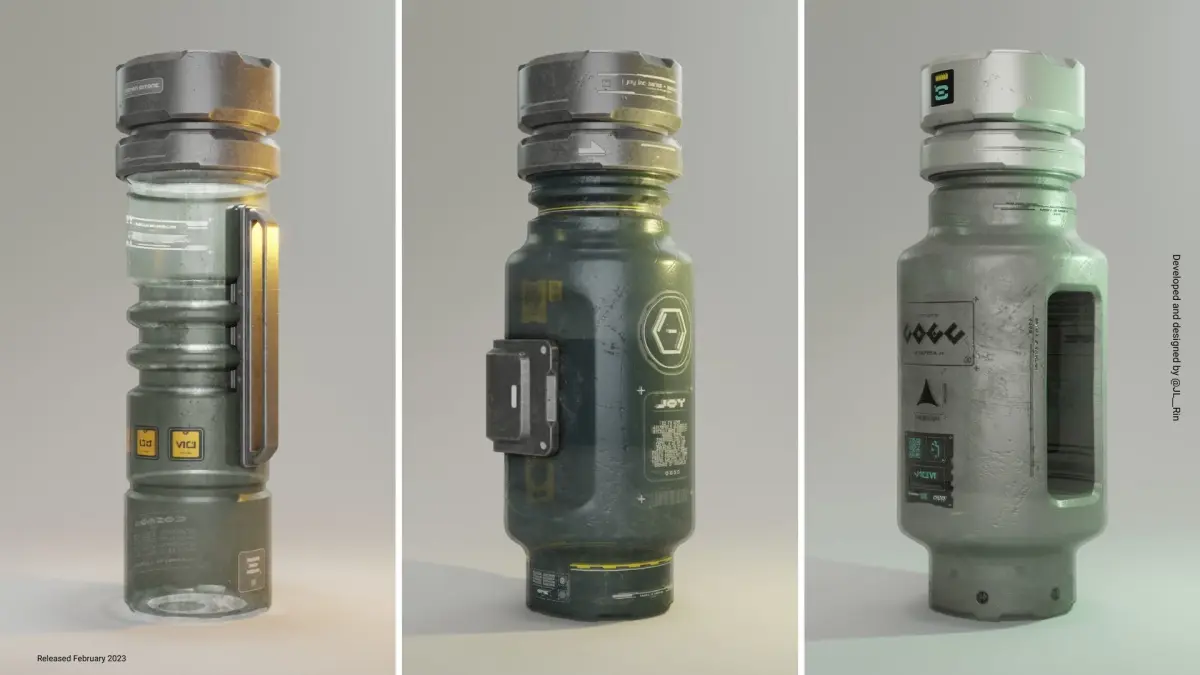 Conceptual design of three bottles of translucent materials with futuristic cyberpunk aesthetics, with high quality textures and decals designed in substance painter. This concept is designed thinking in simple shapes easy to mass produce but with futuristic designs and features inspired by scifi and cyberpunk art.
