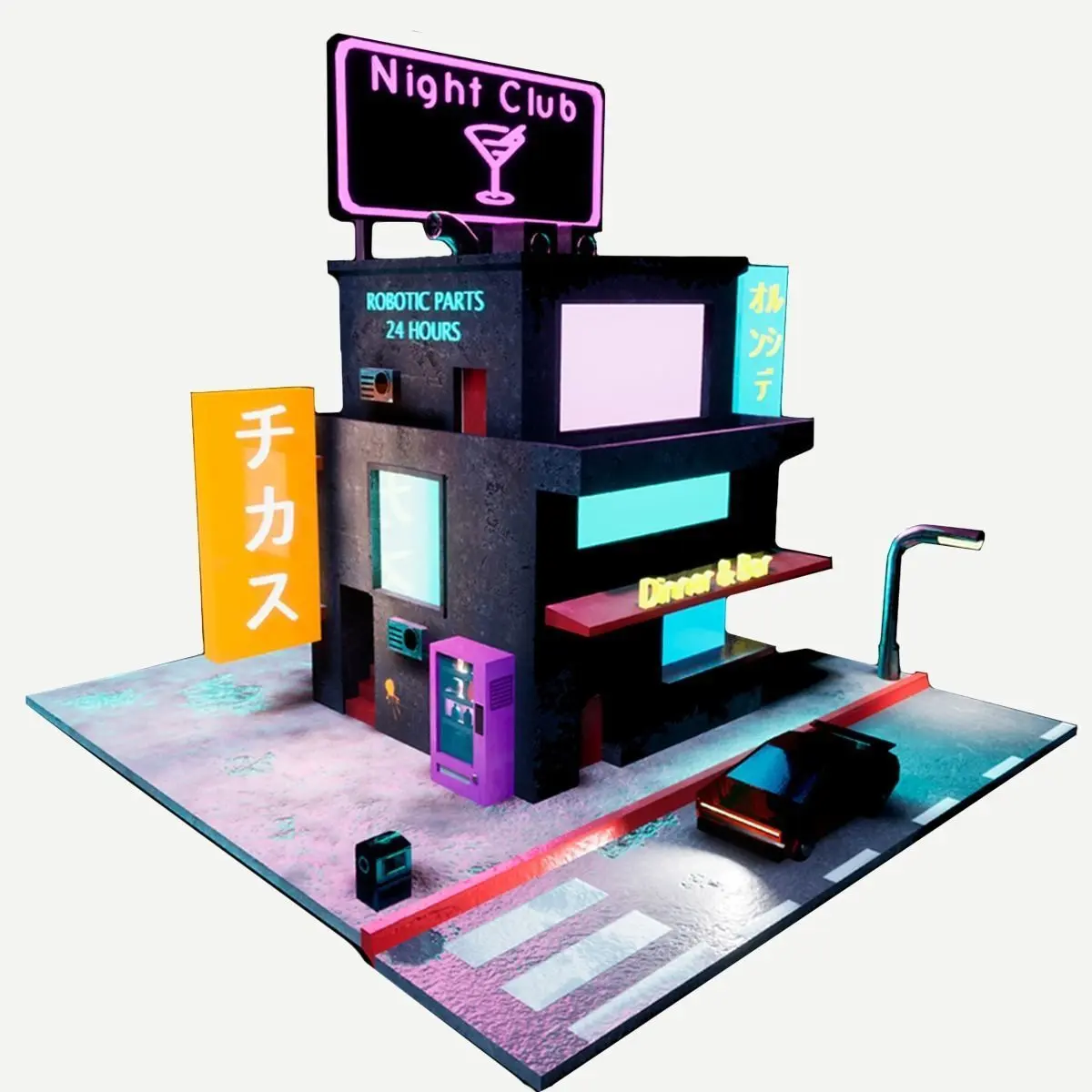 It includes the following mesh:1 Building Exterior Structure3 Neon signs with letters1 Vending Machine with products1 Retrofuturist vehicle1 Floor with trackand details such as ventilation ducts, pole and trash can.