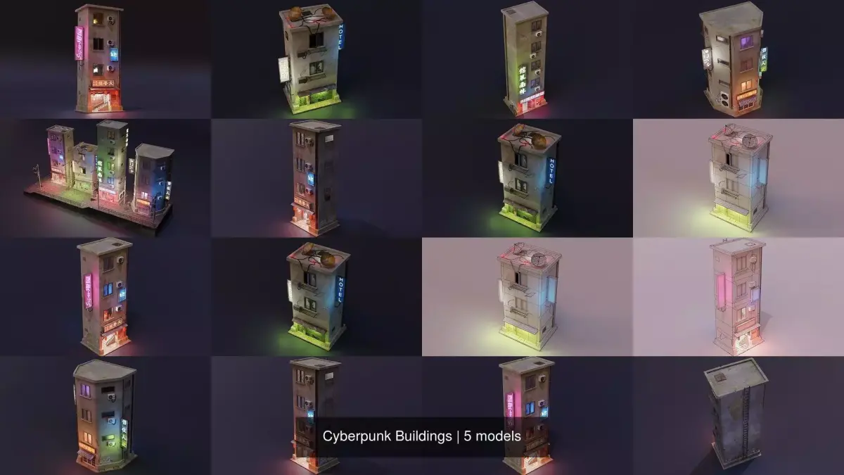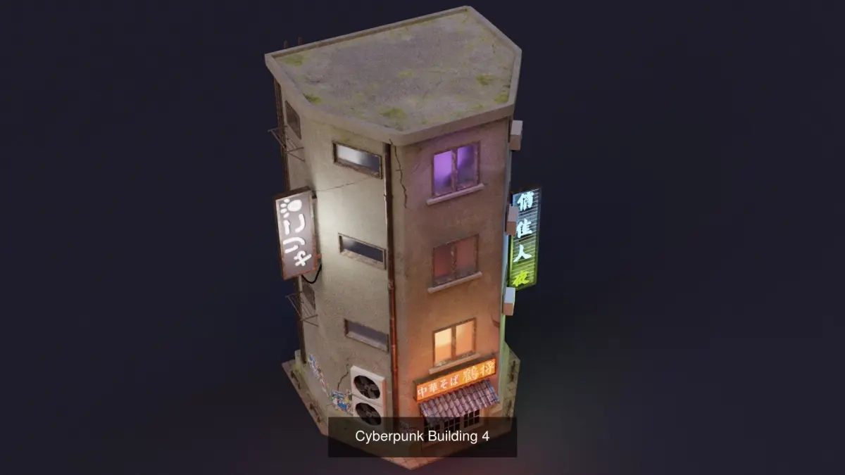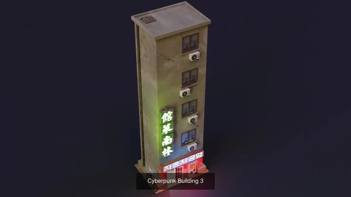 Cyberpunk Building 1: Polygons 2600 Vertices 3380, 4 Materials, 4 Textures: Color, Metallic, Roughness, EmissionCyberpunk Building 2: Polygons 2200 Vertices 2800, 4 Materials, 4 Textures: Color, Metallic, Roughness, EmissionCyberpunk Building 3: Polygons 4400 Vertices 5000, 4 Materials, 4 Textures: Color, Metallic, Roughness, EmissionCyberpunk Building 4: Polygons 3180 Vertices 3900, 4 Materials, 4 Textures: Color, Metallic, Roughness, EmissionScene: Polygons 15600 Vertices 19100, 20 Materials, 20 Textures, 20 Textures: Color, Metallic, Roughness, Emission