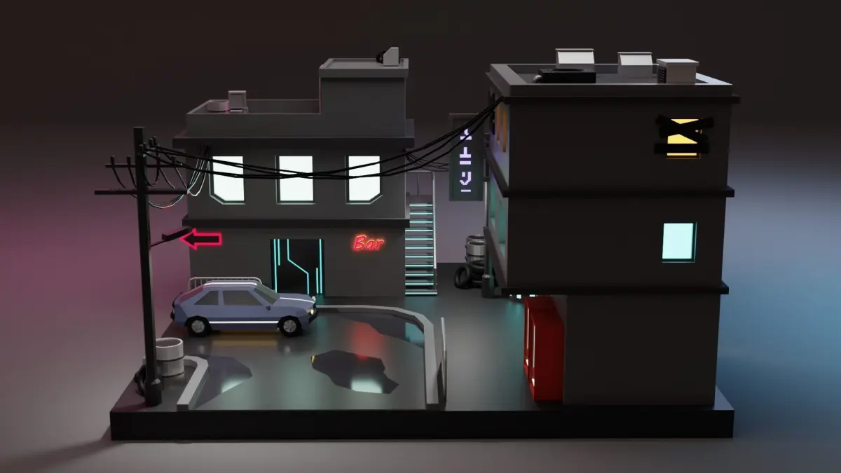 I created this Low poly Cyberpunk Buildings inspired by ayoutube tutorial and using Blender 3.3.0.
