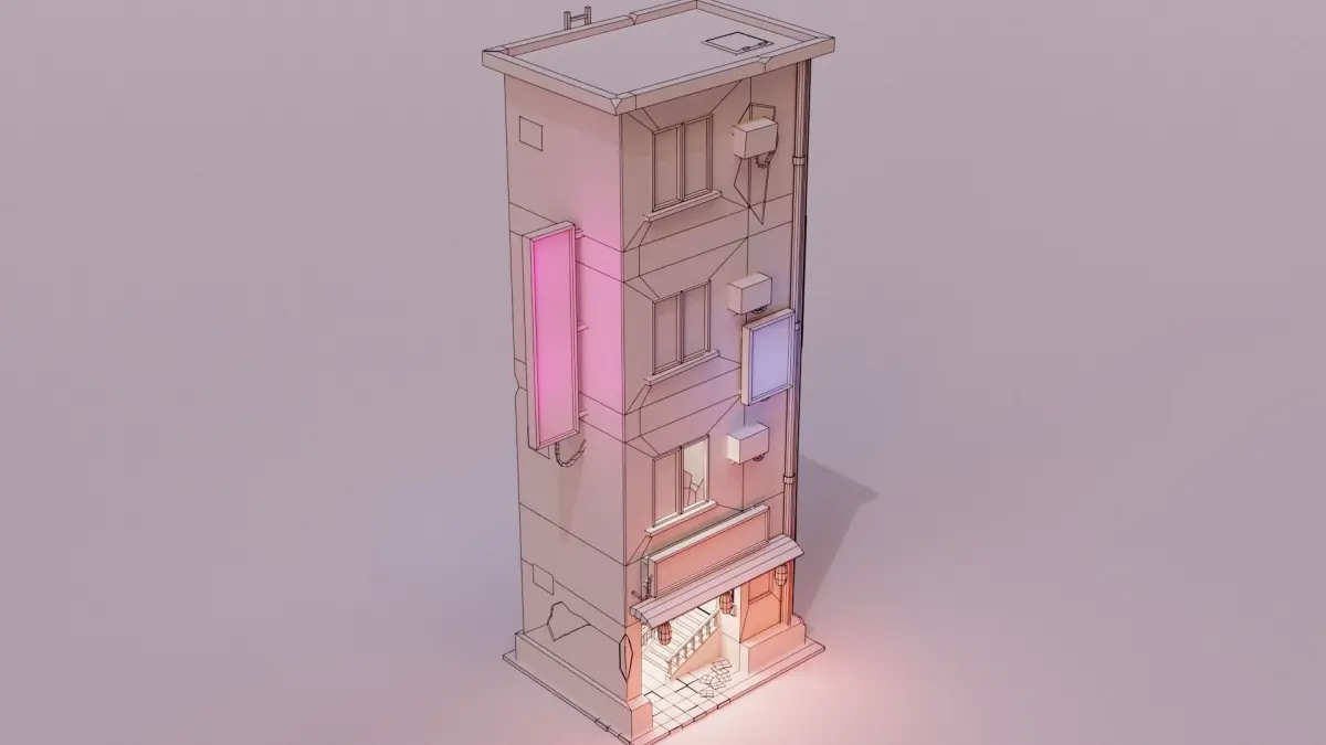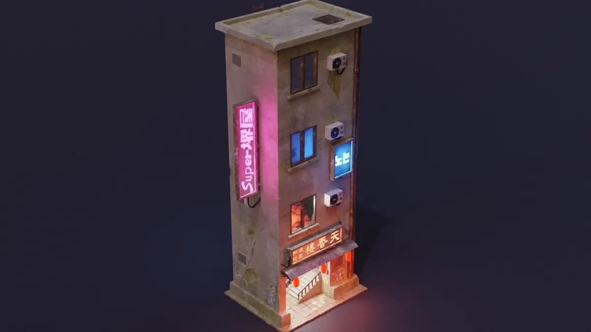 Cyberpunk Building 1: Polygons 2600 Vertices 3380, 4 Materials, 4 Textures: Color, Metallic, Roughness, Emission