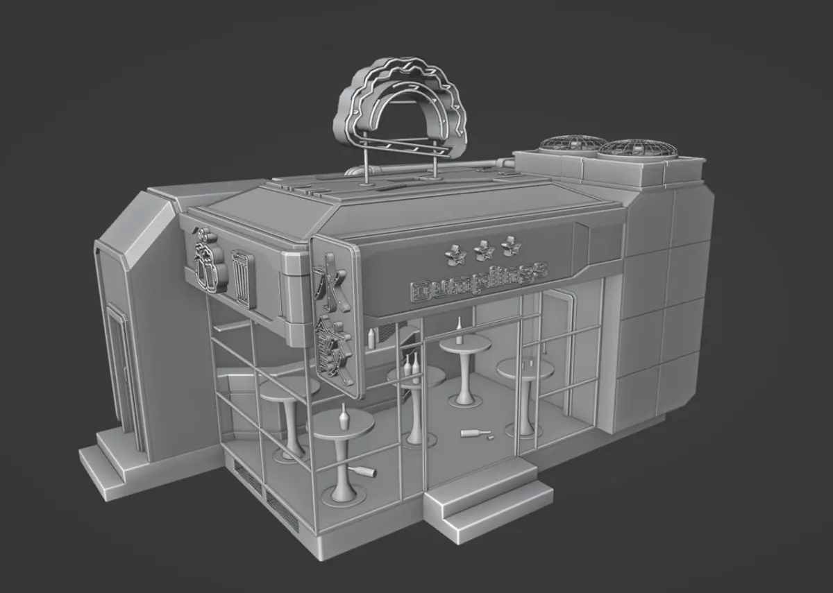 Mini cafe in cyberpunk style with neon signes and cute interior. Low poly
