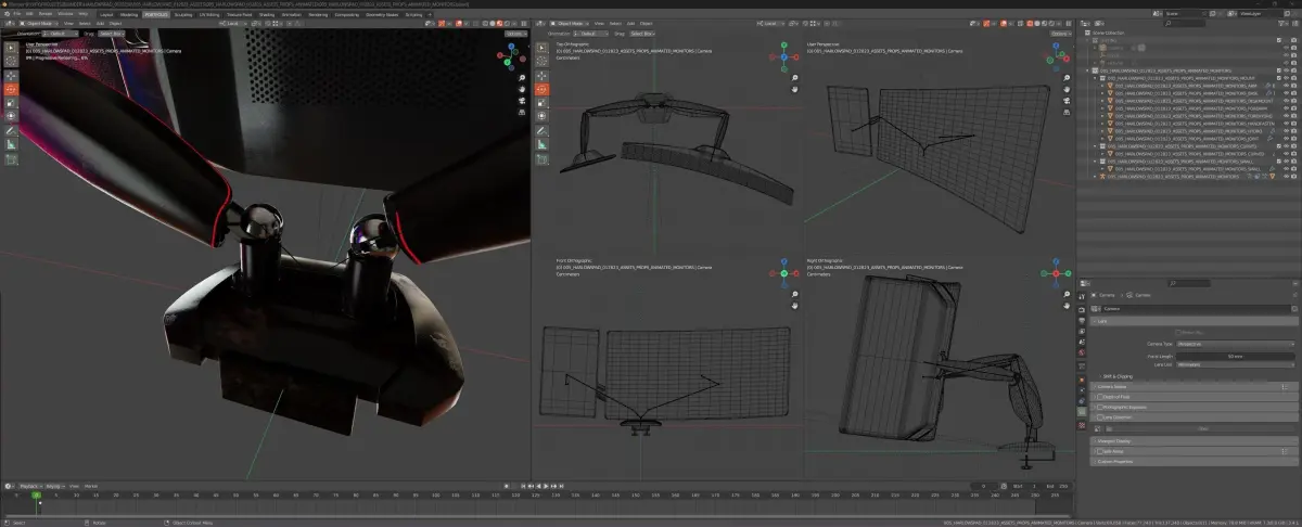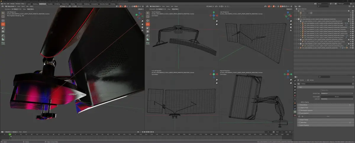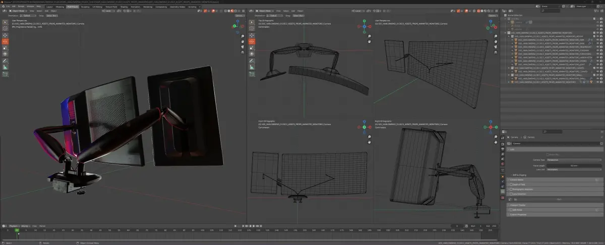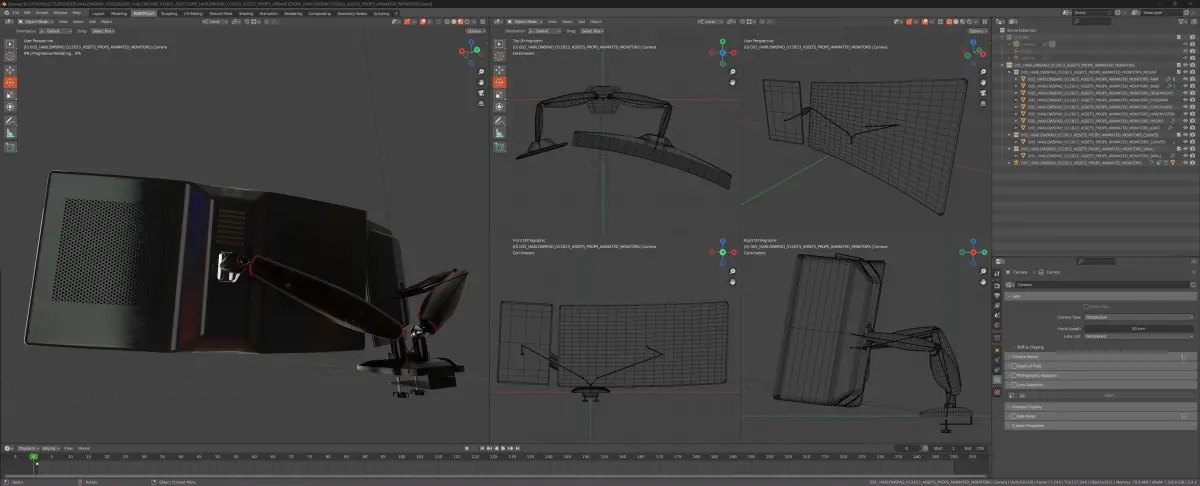 About this asset:Computer monitor stand is fully rigged for relistic movement/position, holds one curved ultrawide LCD display, and one small portrait side monitor. Stand feaatures adjustable handscrews with plastic handle to fit different size desk.