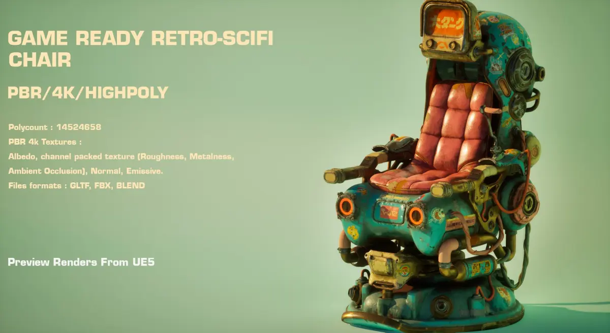 Polycount : 14524658PBR 4k Textures : Albedo, channel packed texture (Roughness, Metalness, Ambient Occlusion), Normal, Emissive. Files formats : GLTF, FBX, BLEND