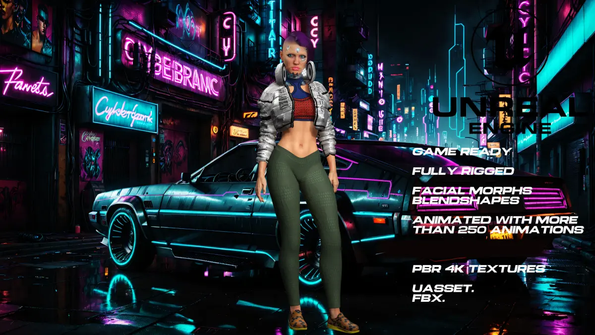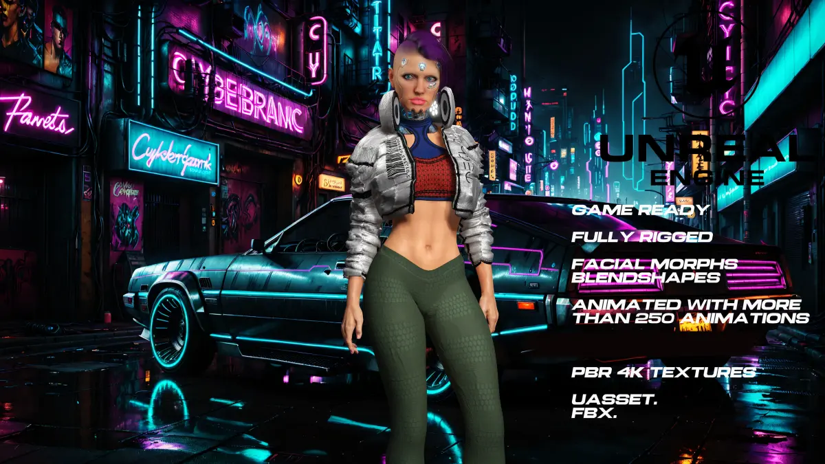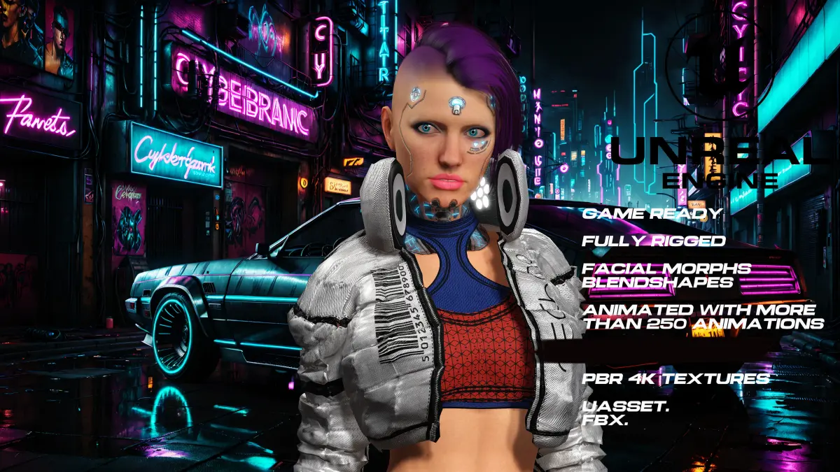 CyberPunk girl. Fully rigged with more than 150 facial morphs, (blendshapes) so you can modify them to your liking. ( Watch the video to see the morphs and animations)