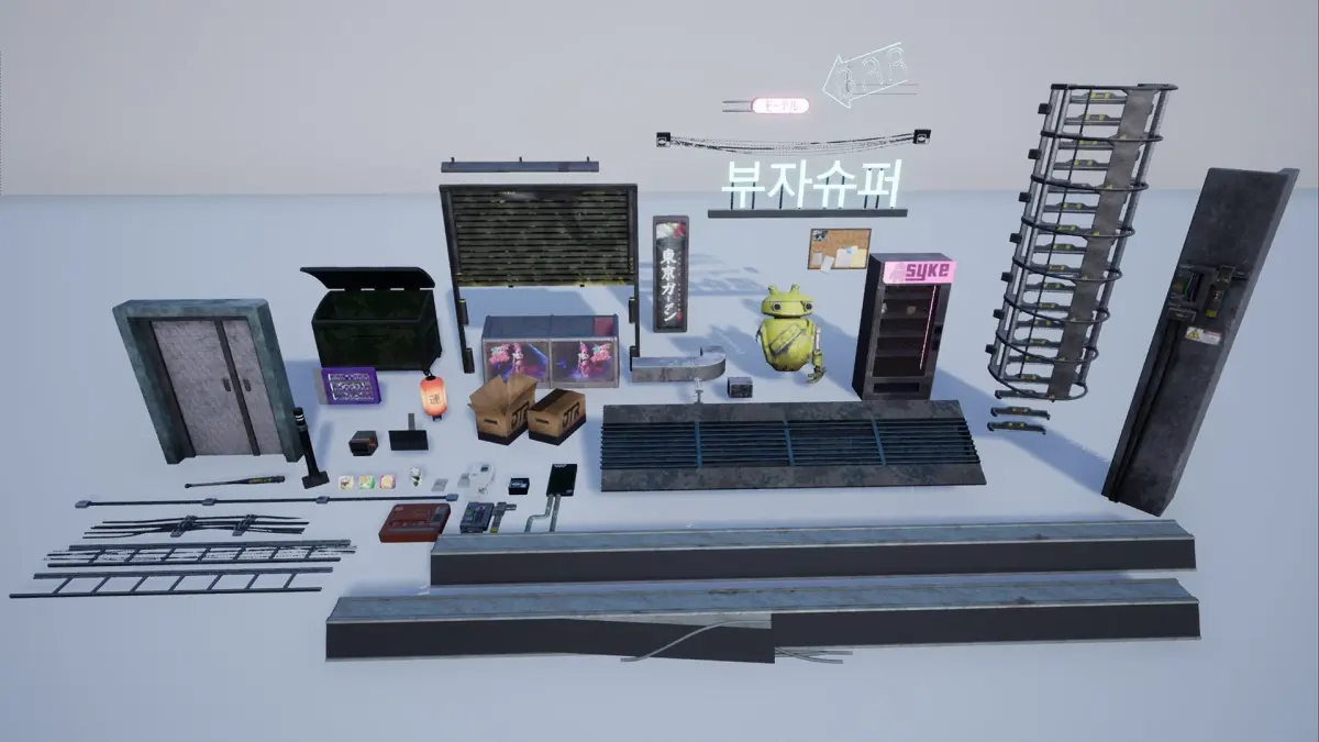 This pack can be used to add more detail to sci fi scenes and really make them look realistic. The pack contains assets such as; Neon signs, Garage door, Electric Boxes, Chinese Lantern, Dumpster, Ladder, Cables, 2 TV's, Vending Machine, AirVent, Robot, Lucky cat, Road Curbs, Door, Baseball Bat, Cardboard Boxes, Drinks Fridge and more!