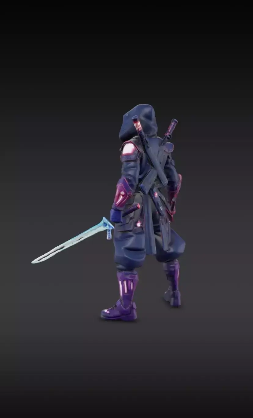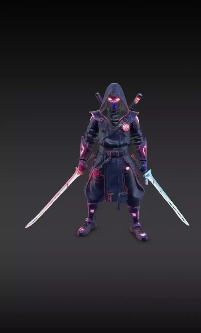 This is a high-quality cyberpunk ninja hero 3D character, designed for use in games, cinematics, VR/AR, and animations. The model combines a futuristic cyberpunk style with traditional ninja aesthetics, featuring advanced armor, neon accents, and iconic weapons.