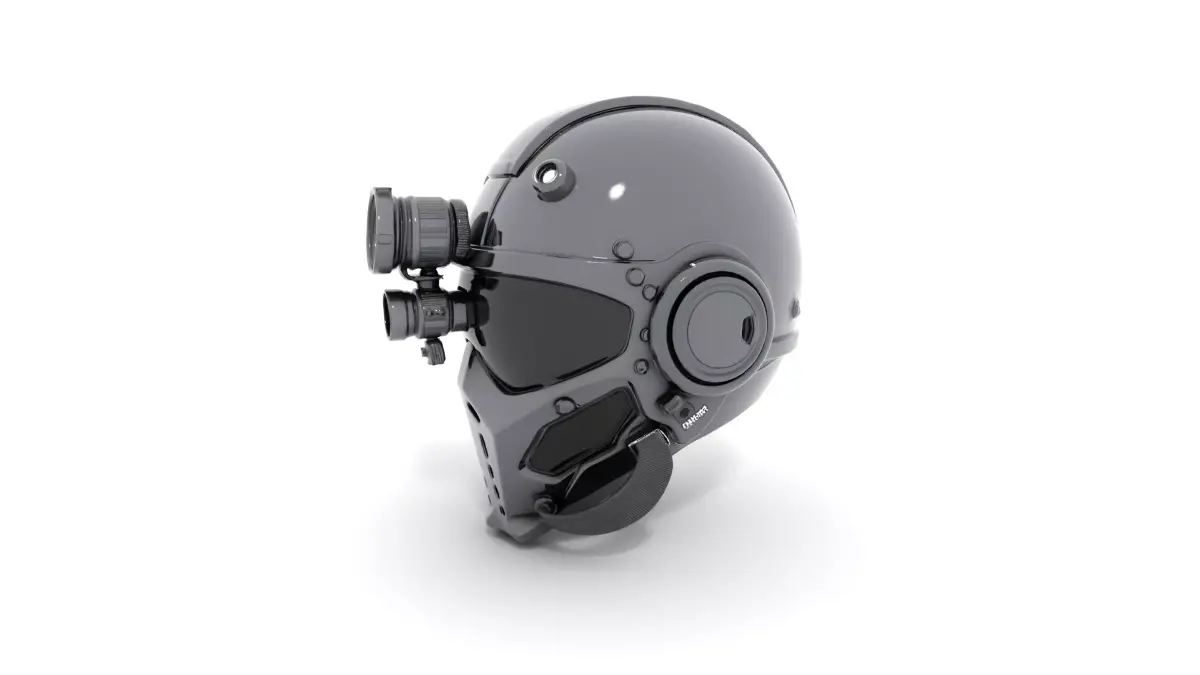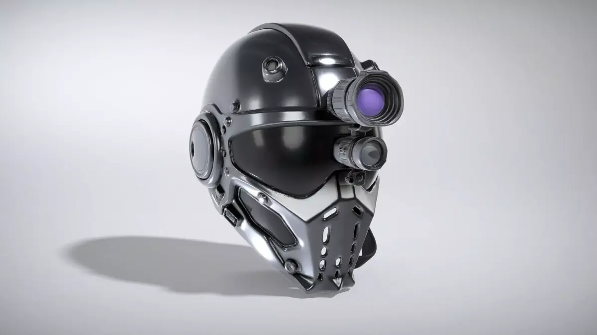 This cyberpunk riot helmet showcases a sleek design with a glossy black visor and advanced features like external camera pods and a detachable night vision monocular. Ideal for futuristic scenes, it offers high detail levels for various applications, from production rendering to game engines. Each model is optimized for performance with multiple levels of detail, ensuring versatility in use.