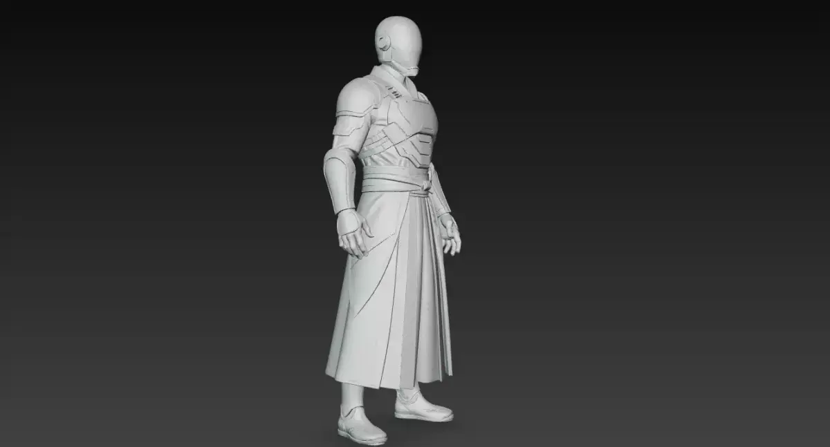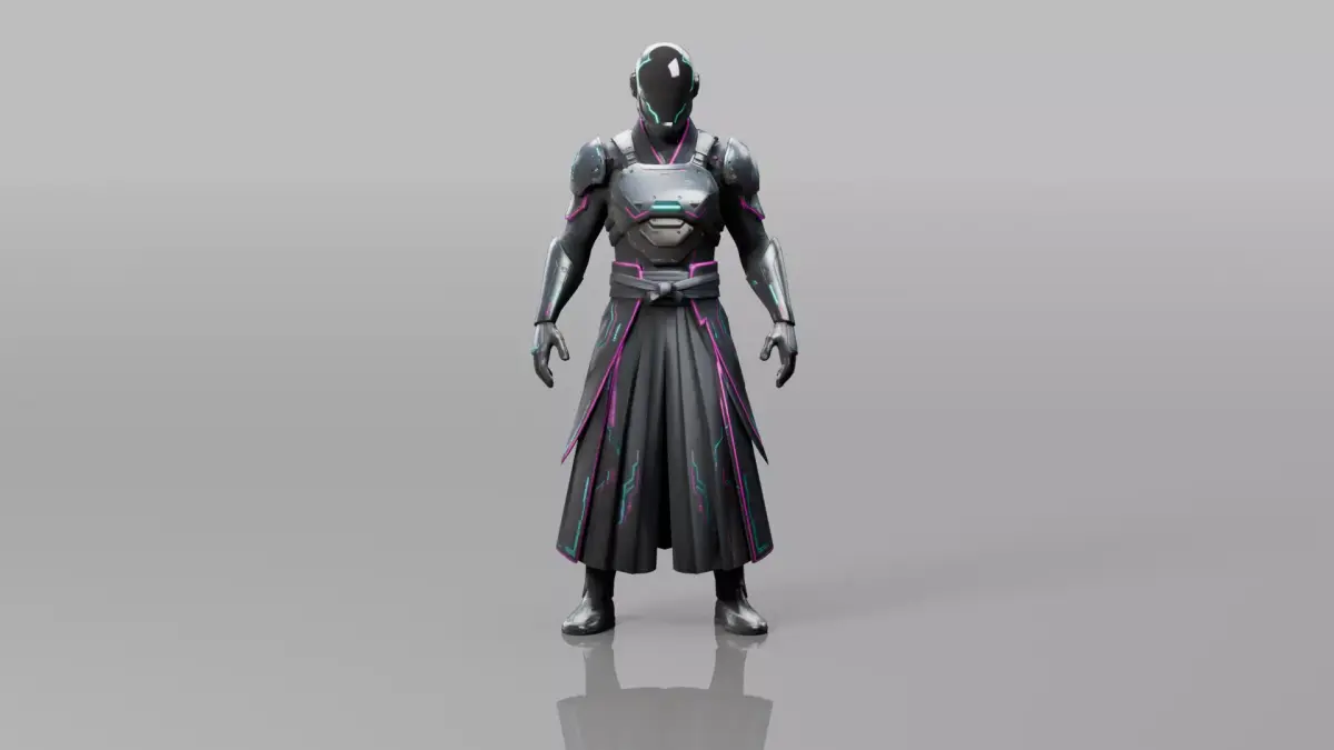 The face is fully concealed beneath a sleek futuristic helmet, eliminating the need for facial rigging while maintaining a mysterious and powerful identity. The outfit combines lightweight futuristic armor with flowing fabric panels inspired by traditional samurai garments, emphasizing speed, discipline, and precision rather than brute force.