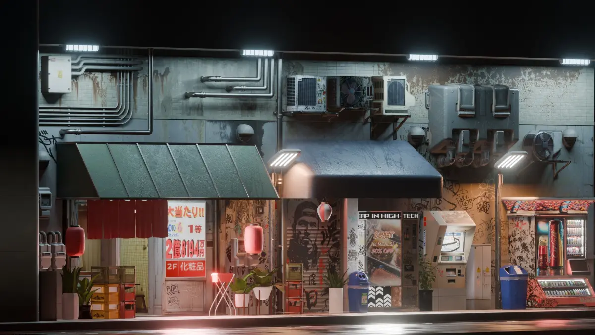 Cyberpunk Street And Vending Machine available use with Blender 4.1, midpolygon and good quality detailed props, all models texture and scene made by me.