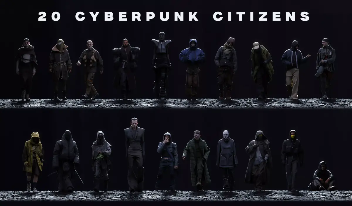 Keywords: Cyberpunk, cyberpunk characters, cyberpunk NPC, cyberpunk crowd, street characters, futuristic civilians, sci-fi characters, dystopian future, urban sci-fi, modular characters, modular character pack, character asset pack, NPC characters, crowd characters, sci-fi clothing, futuristic clothing, civilian NPCs, environment population, crowd asset pack, game assets, 3D characters, character models, background characters, population assets, indie game assets, RPG characters, Unreal Engine, Unity, Blender