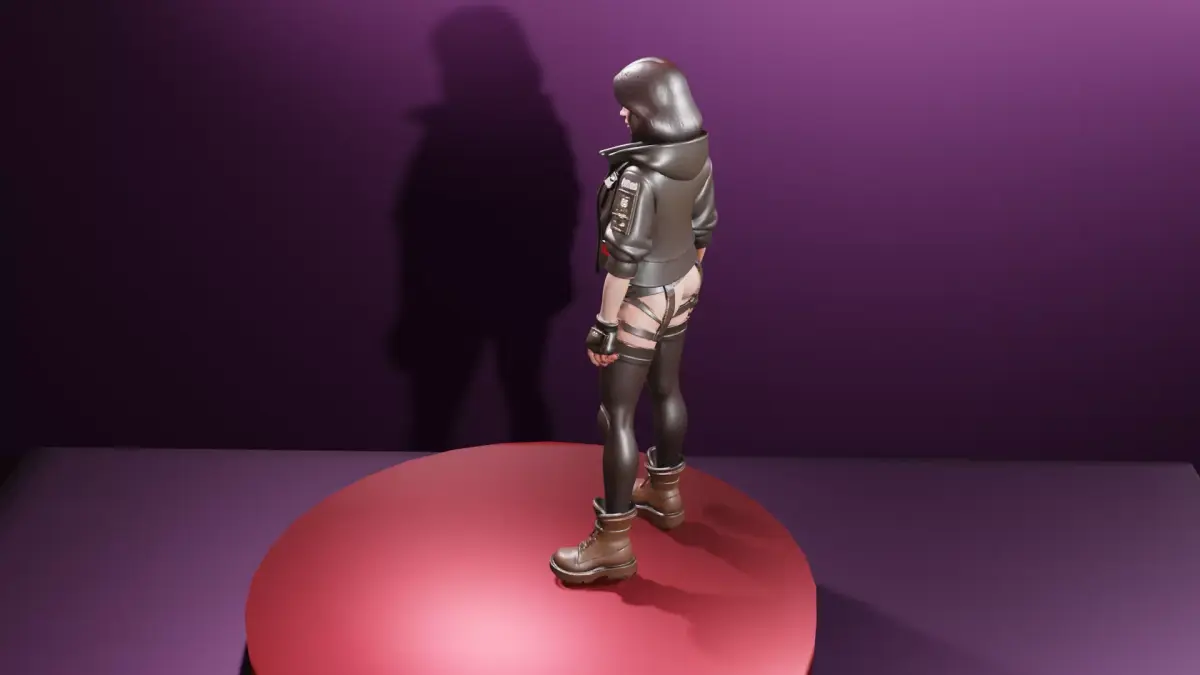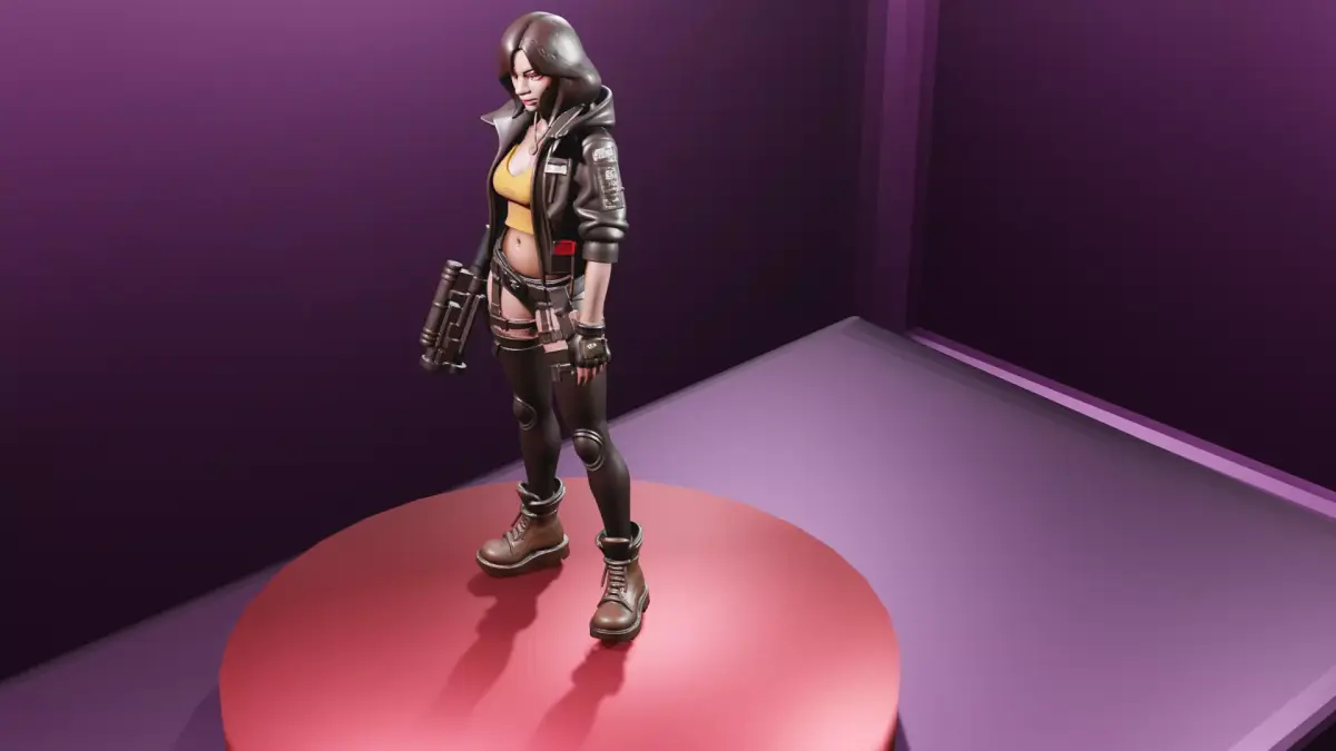 A detailed 3D female character with a modern cyberpunk street style. Dressed in a cropped yellow top, black leather jacket, tactical belts, and thigh-high gear, she carries a futuristic weapon that emphasizes her rebellious look. Perfect for cyberpunk-themed games, VR/AR experiences, cinematic animations, and sci-fi concept art.