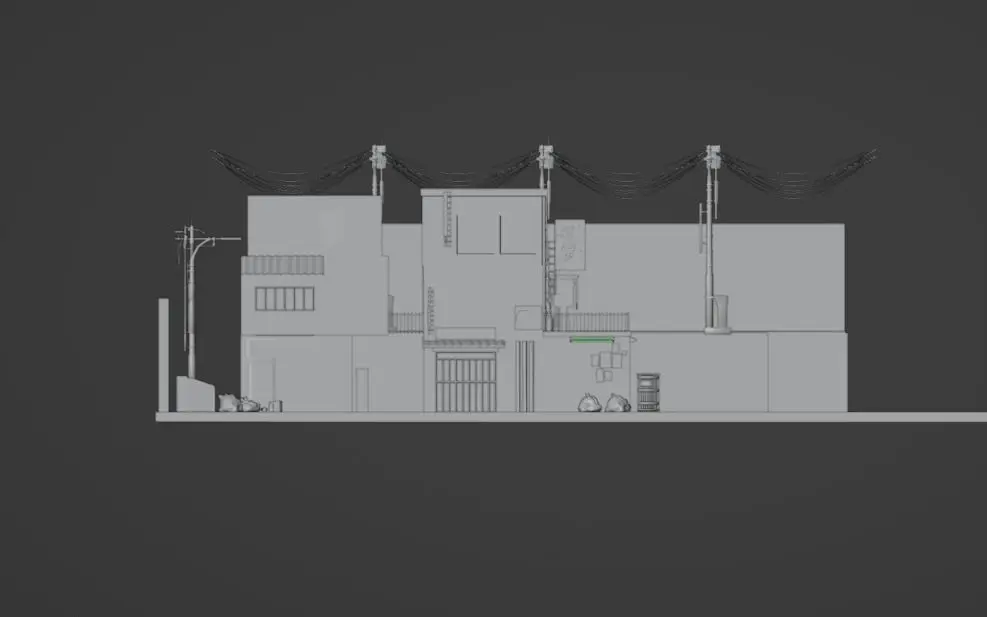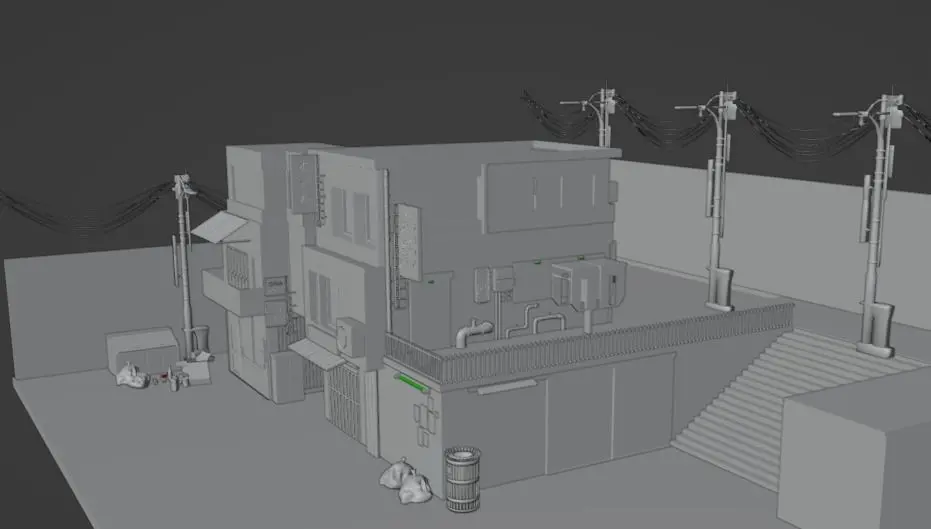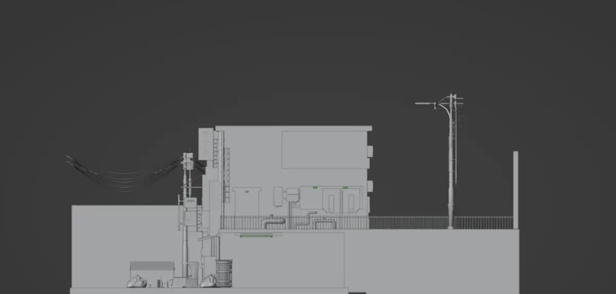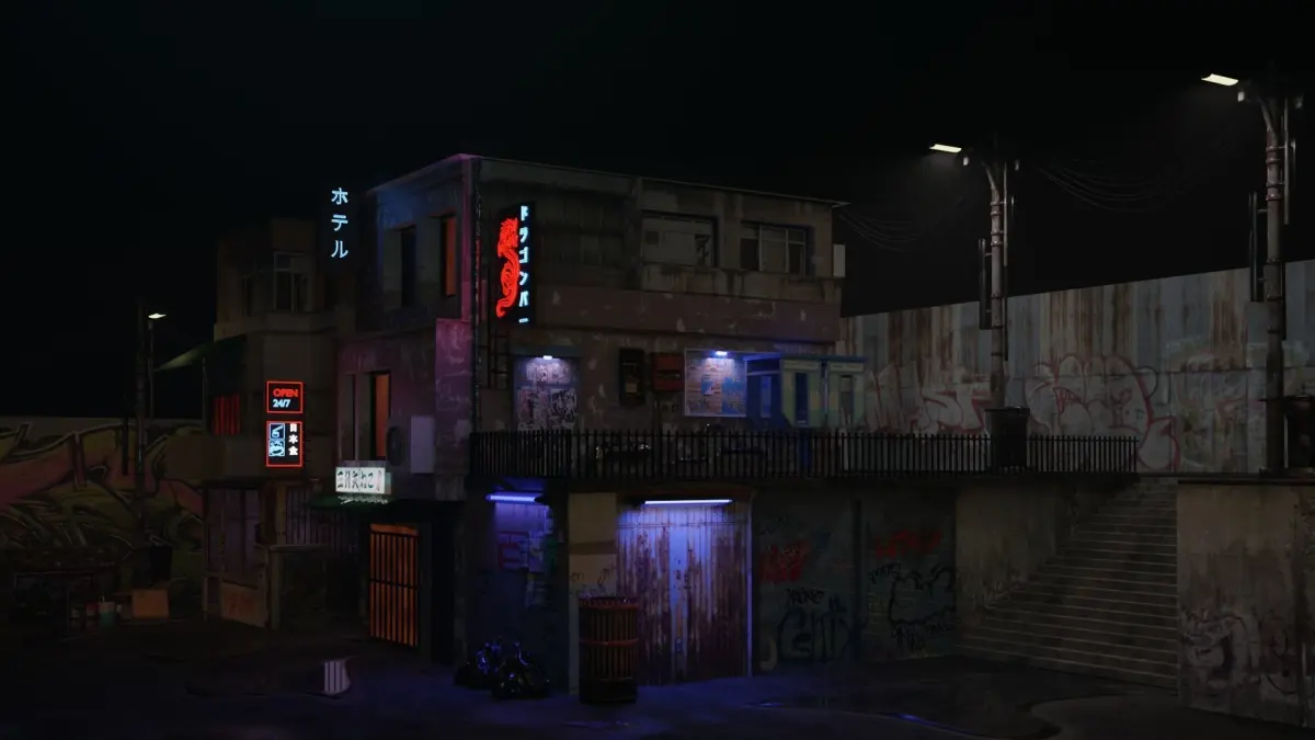 Cyberpunk street scene includes 2 buildings + various assets. -garbage set-pipes-neon signs-air conditioners-street lamps-telephone box