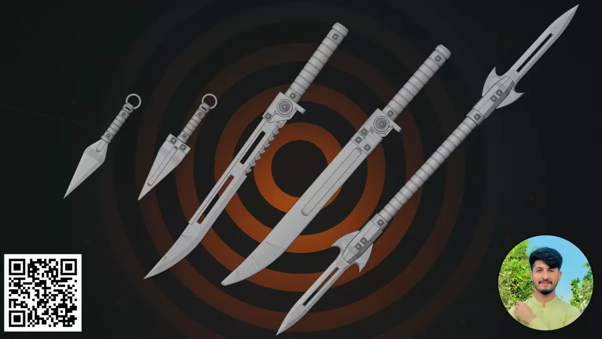 This is a high-quality 3D asset pack featuring a collection of Futuristic Tactical Melee Weapons. The set includes two specialized kunai-style throwing daggers, two heavy-duty serrated tactical swords, and a dual-ended high-tech spear. With a striking industrial red and carbon-black finish, these weapons are designed for elite futuristic assassins, cyberpunk mercenaries, or sci-fi warrior classes.