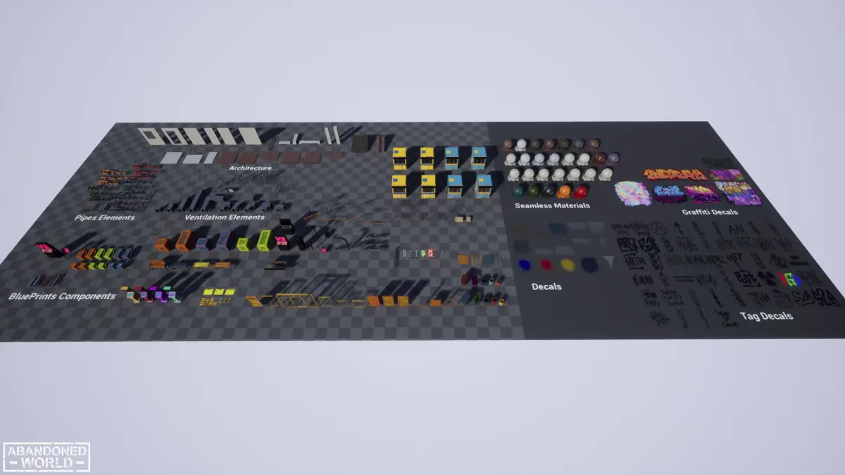 The set includes graffiti drawings, inscriptions and tags made specifically for this package. The stage is prepared with baked static lighting. Also in the package there are elements of ventilation and pipes, garbage, boxes, a stall, monitors, technical equipment and other.