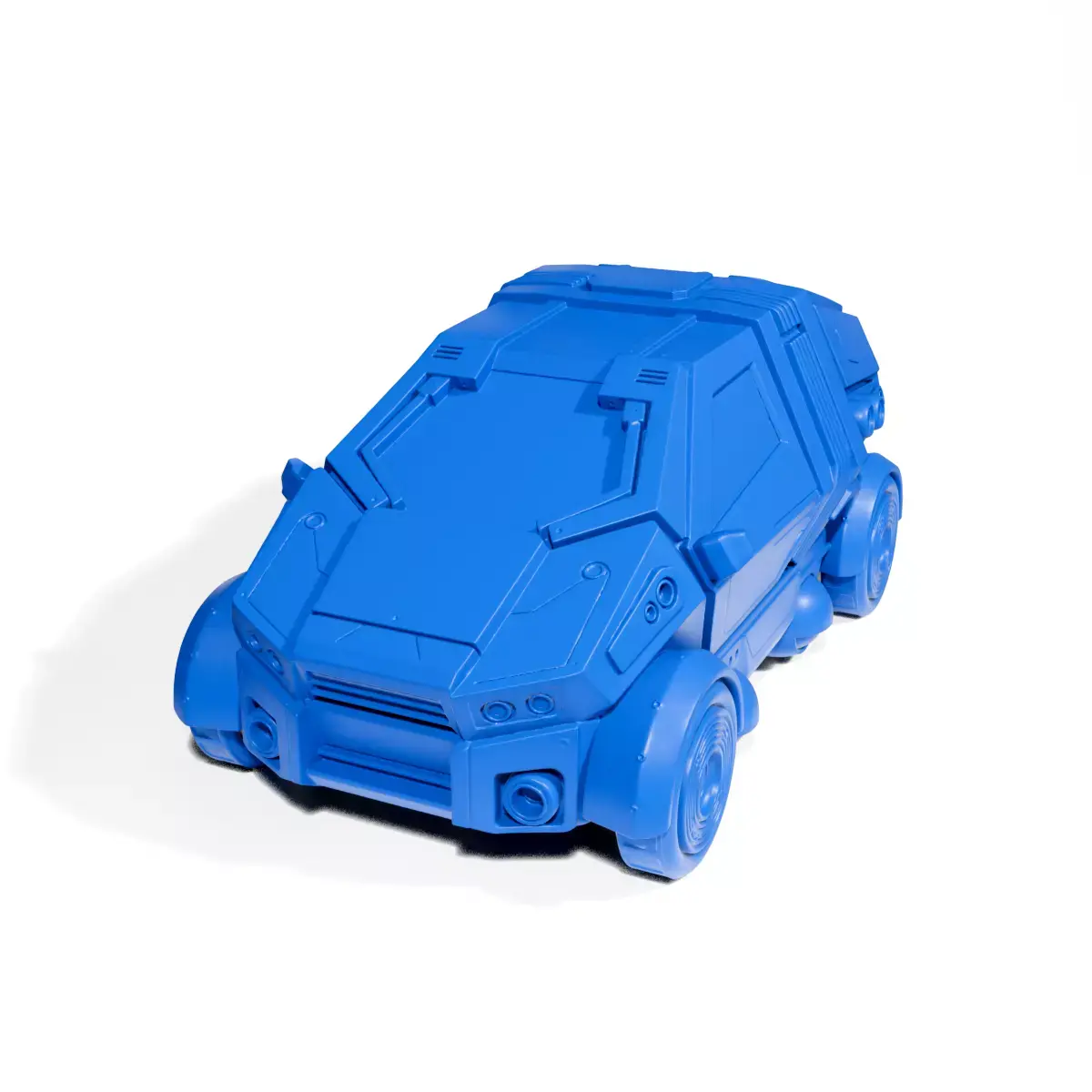 This 3D printed model represents a futuristic cyberpunk urban vehicle featuring dynamic lines and complex geometric details.