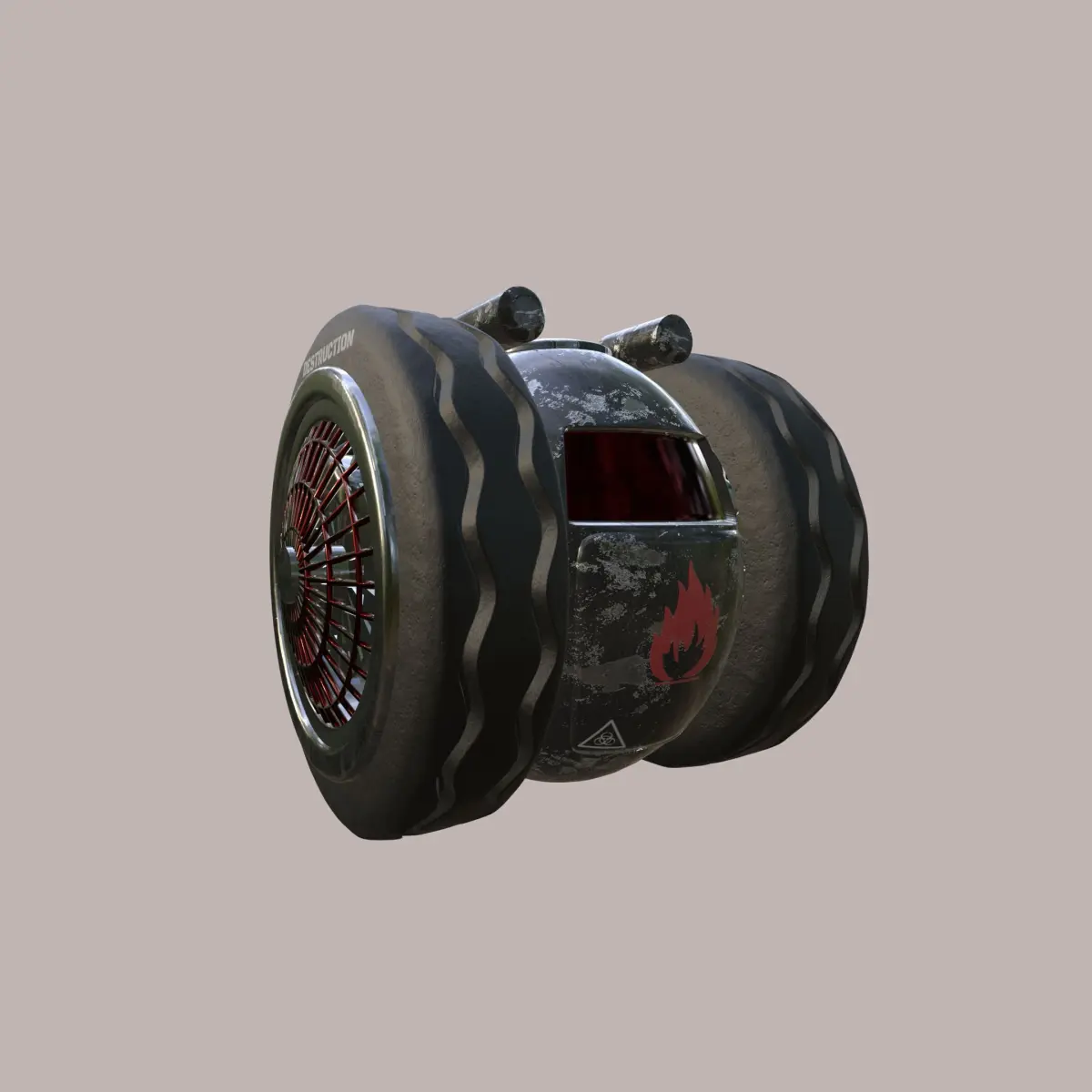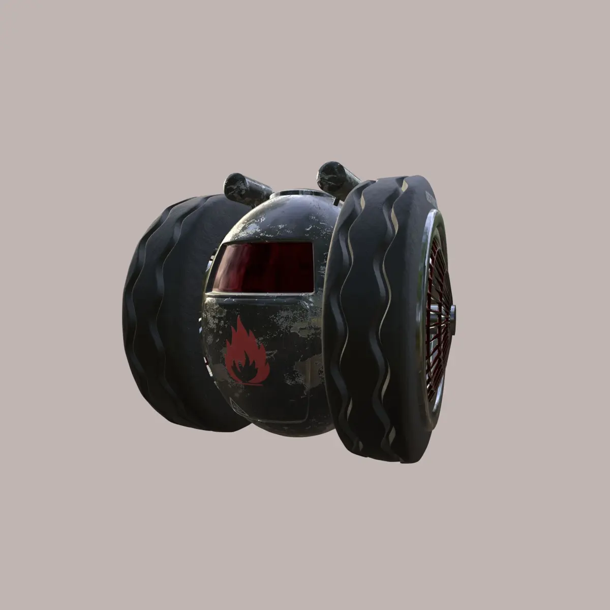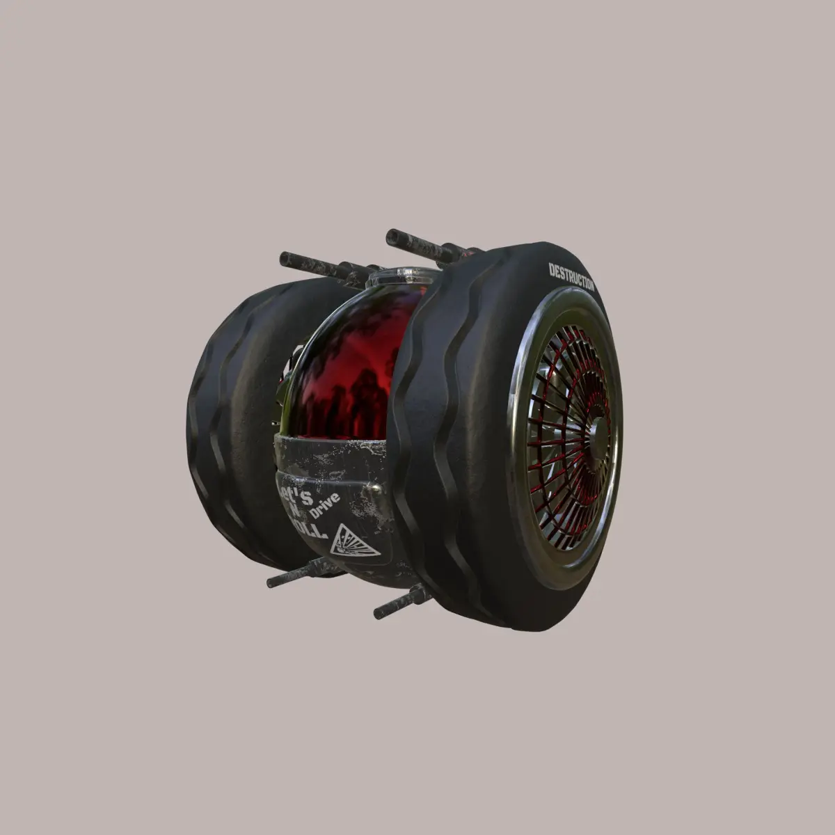 This futuristic cyberpunk-style hover vehicle model features a bold, spherical central cockpit with heavy-duty dual wheels and mounted gun turrets. Designed for high-intensity urban environments, it has a rugged aesthetic with weathered decals and high-gloss accents. The phrase “Let’s Roll” is prominently displayed on the body, enhancing its rebellious vibe.