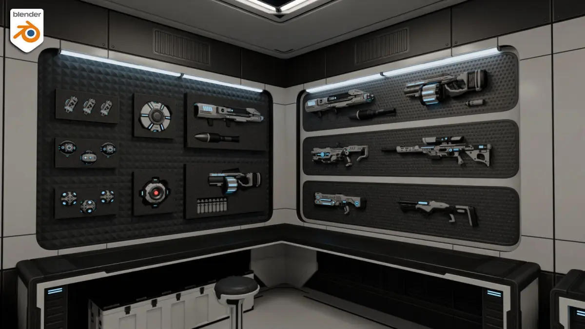 High-quality interiors of Weapon Arsenal and Lounge rooms for Sci-Fi/ Futuristic/ Cyberpunk PC & VR games and video production.