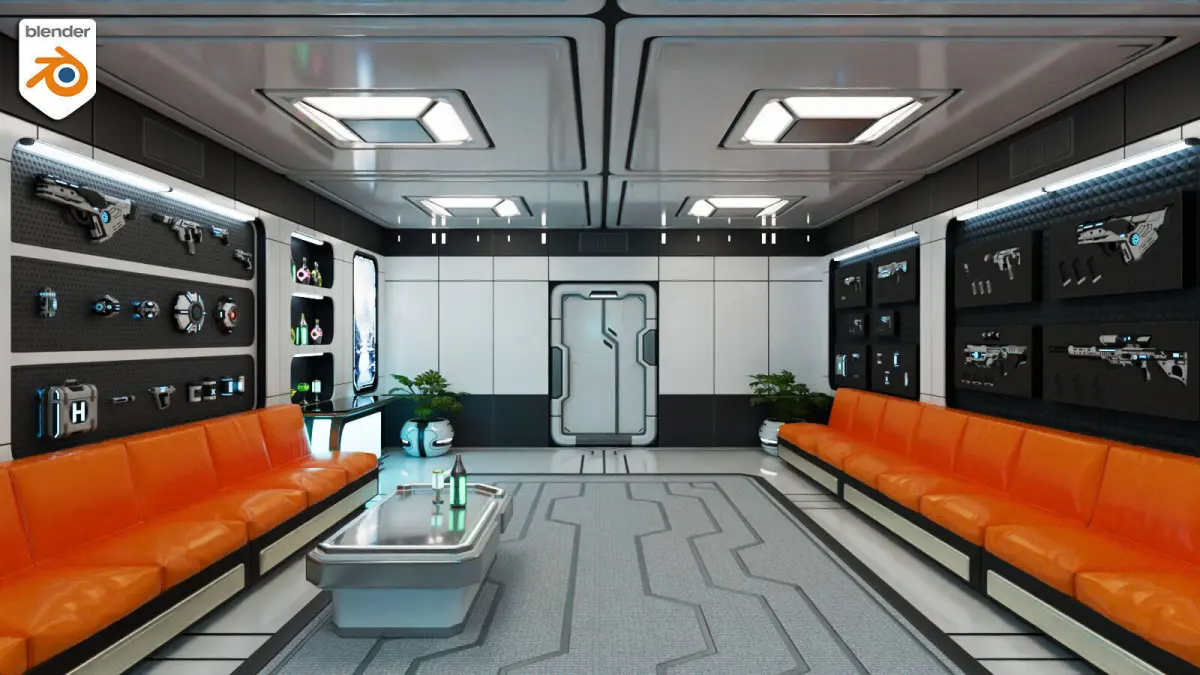 - Lounge Area – a weapon collector’s room or a relaxation zone with a bar area and a large holographic screen showcasing weapons in real time.