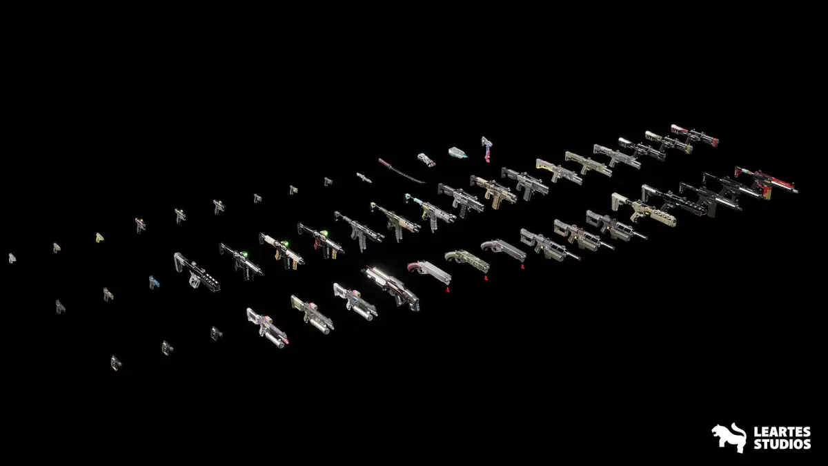 IMPORTANT NOTE: The asset pack had 265 Unique Meshes. 52 of them are complete weapons and 213 of them are smaller parts of the weapons. For instance, one of the complete weapons have a combined static mesh and also have the handgrip, silencer and sights as static meshes.