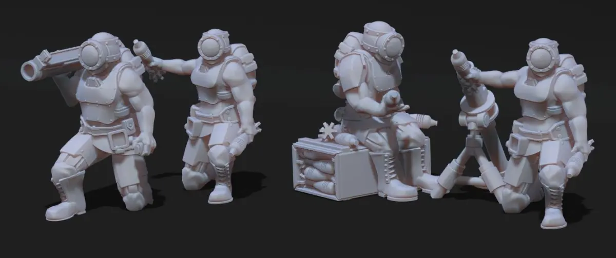 This multi part kit contains the components needed to build a heavy weapons squad for the Cyberzerkers line. There are a great number of options, and heavy weapon slots are cross compatible with those from the cyberzerkers tank sponson mounts.