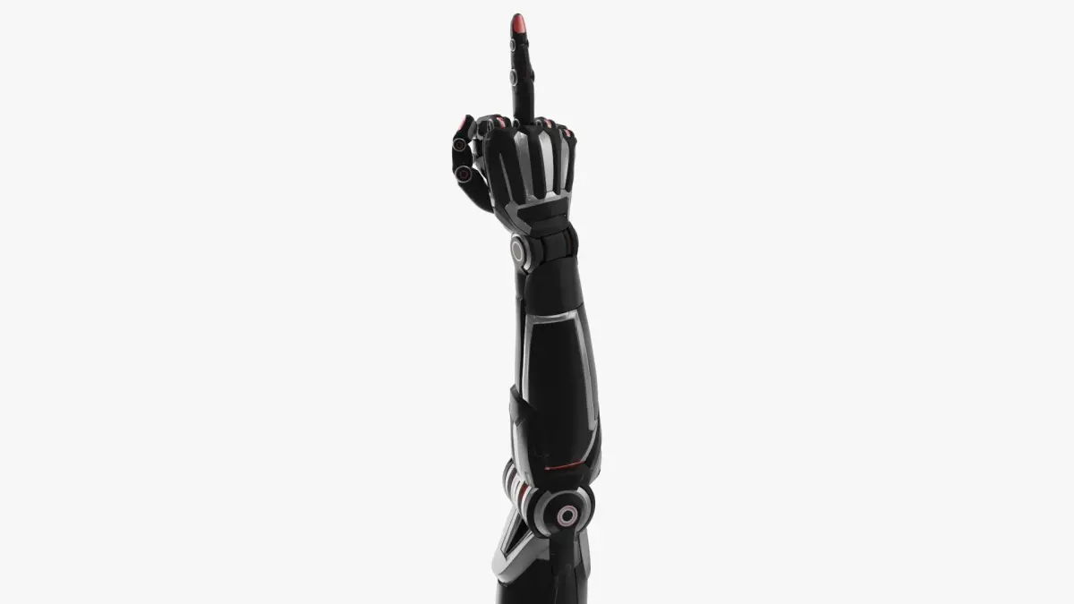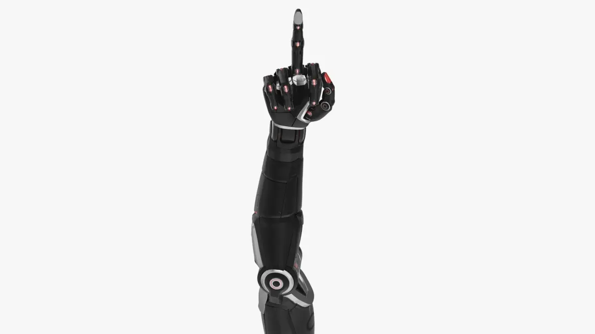 Cyborg arm shows middle finger is a high quality, photo real model that will enhance detail and realism to any of your projects. The model has a fully textured, detailed design that allows for close-up renders, and was originally modeled in 3ds Max 2014 and rendered with V-Ray 3,6