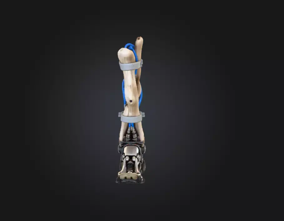The Cyborg Bone-Strider Limb is a striking fusion of skeletal biology and advanced robotics, designed to embody the eerie beauty of biomechanical evolution. At first glance, the limb appears macabre—an exposed, natural bone structure stretching upward like a relic resurrected from the past. Yet the bones are reinforced, stabilized by sleek metallic braces and connected through vibrant blue cables that pulse like artificial veins. This delicate interplay between organic form and engineered precision creates a visual narrative of a limb caught between life and machine.