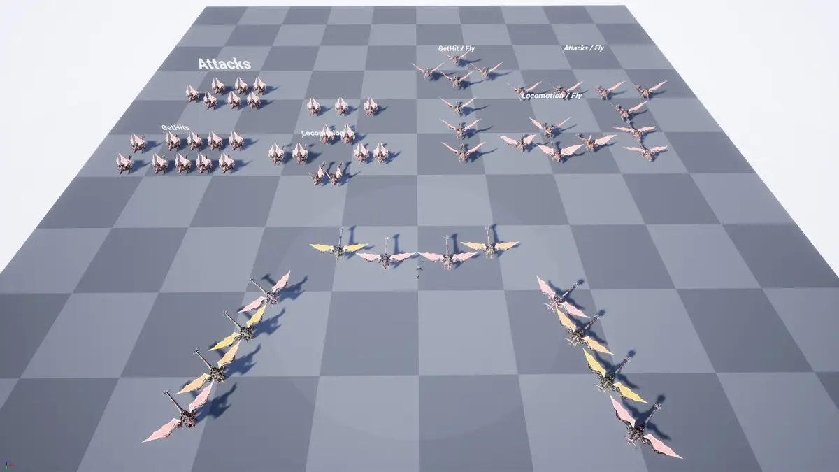 Attack - 7Idle - 2Knock - 4Death - 2Gethit - 8Turn 90 - 2Turn 180 - 1Walk - 8Roar - 1Transitions - 2Fly Stage:Attack - 4Fall - 3Fly (Front, Left, RIght, Back) - 4Fly Accelerated - 3GetHit - 4Turn - 3Idle - 1