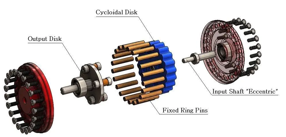 The Cycloidal gear is a type of gear that use tooth profile based on cycloidal curve to generate high reduction ratio 100:5A cycloidal curve is a curve of one circle roles around the outside or inside of another circle.
