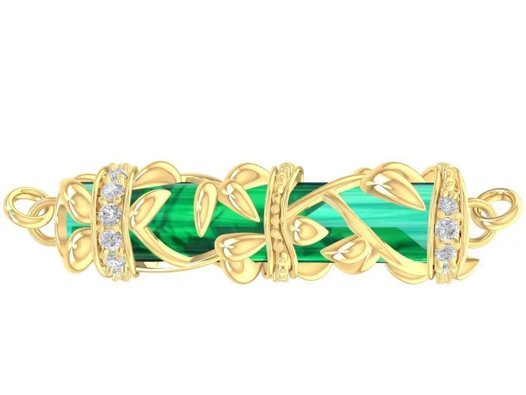This 3D model is a cylinder gemstone floral gold pendant designed with artistic and luxurious details. The pendant features a cylindrical center gemstone in vivid colors such as green or pink, decorated with gold floral patterns and accented with small round diamonds on the edges. The combination of bright gemstones and detailed gold framework creates a striking and elegant jewelry piece.