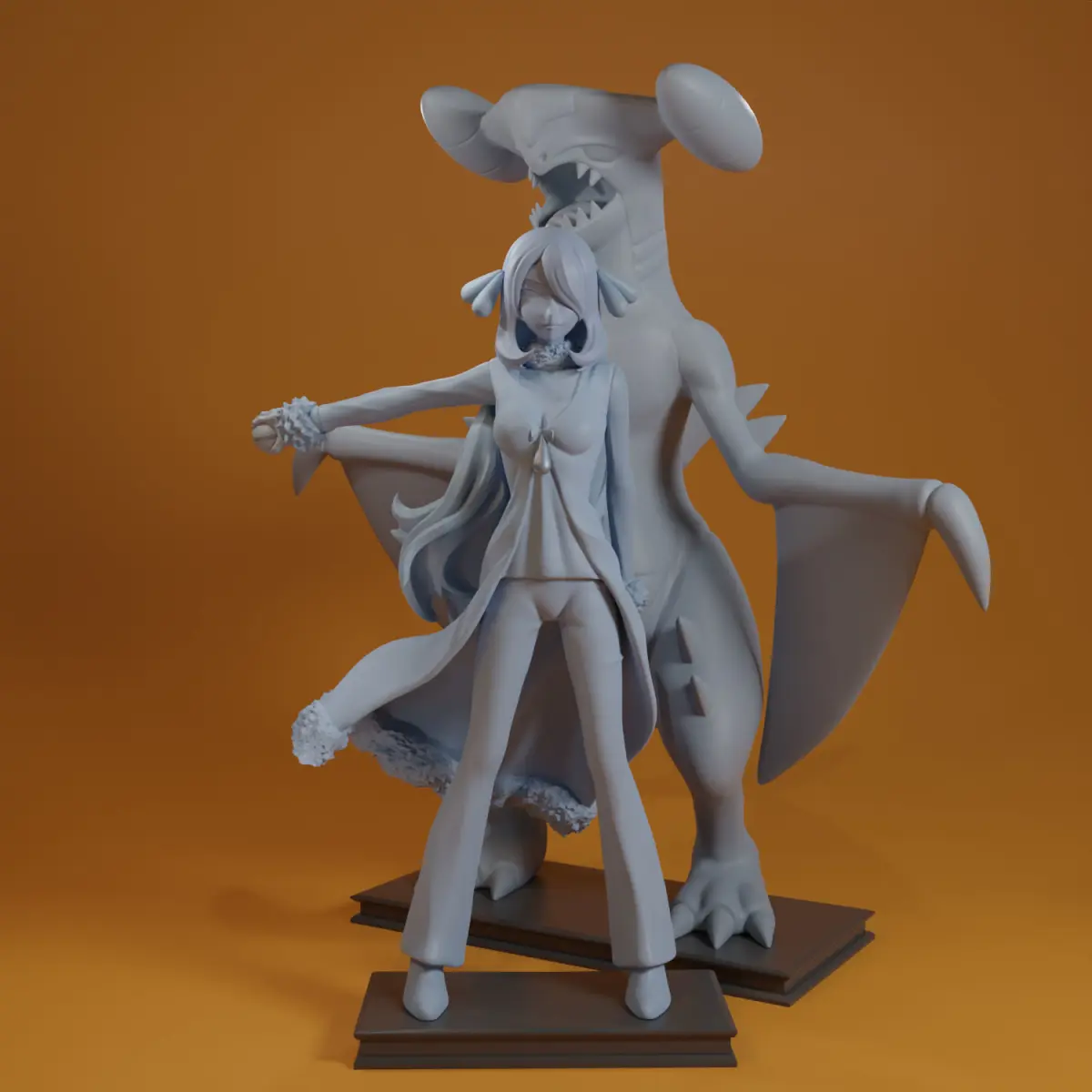 -Garchomp is a bipedal, draconian Pokémon that is primarily dark blue in color. It has red on its underbelly from the lower jaw to the middle of the abdomen, including the undersides of its arms. A patch of gold comes to a point below the red on its belly, and a golden star shape adorns the tip of its snout. Garchomp has horn-like appendages that resemble a jet or plane's engines, giving it an appearance similar to a hammerhead shark. These allow it to sense its prey from a long distance. Its large mouth features razor-sharp teeth. The feet have three white talons, and each arm has a single large, white claw for a hand. Curved fins sprout from the arms, creating wings that allow Garchomp to fly. Garchomp also has a large dorsal fin and another on its tail that resembles a shark tailfin. The male's dorsal fin has a notch on it. Pairs of small, white spikes protrude from its upper arms and legs, and there are gill-like slits on the sides of the neck. The eyes are intense, with black sclerae and gold-colored irises.