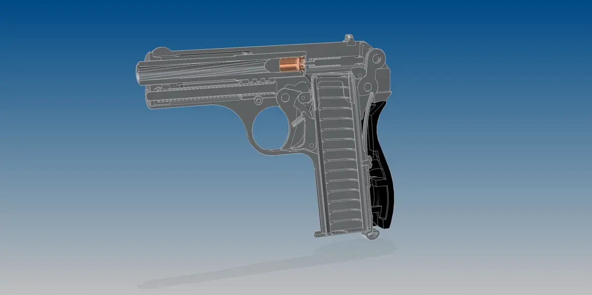 Full assembled model of Czechoslovak pistol Cz-27 and its 7,65 mm bullet(also known like 32.ACP)