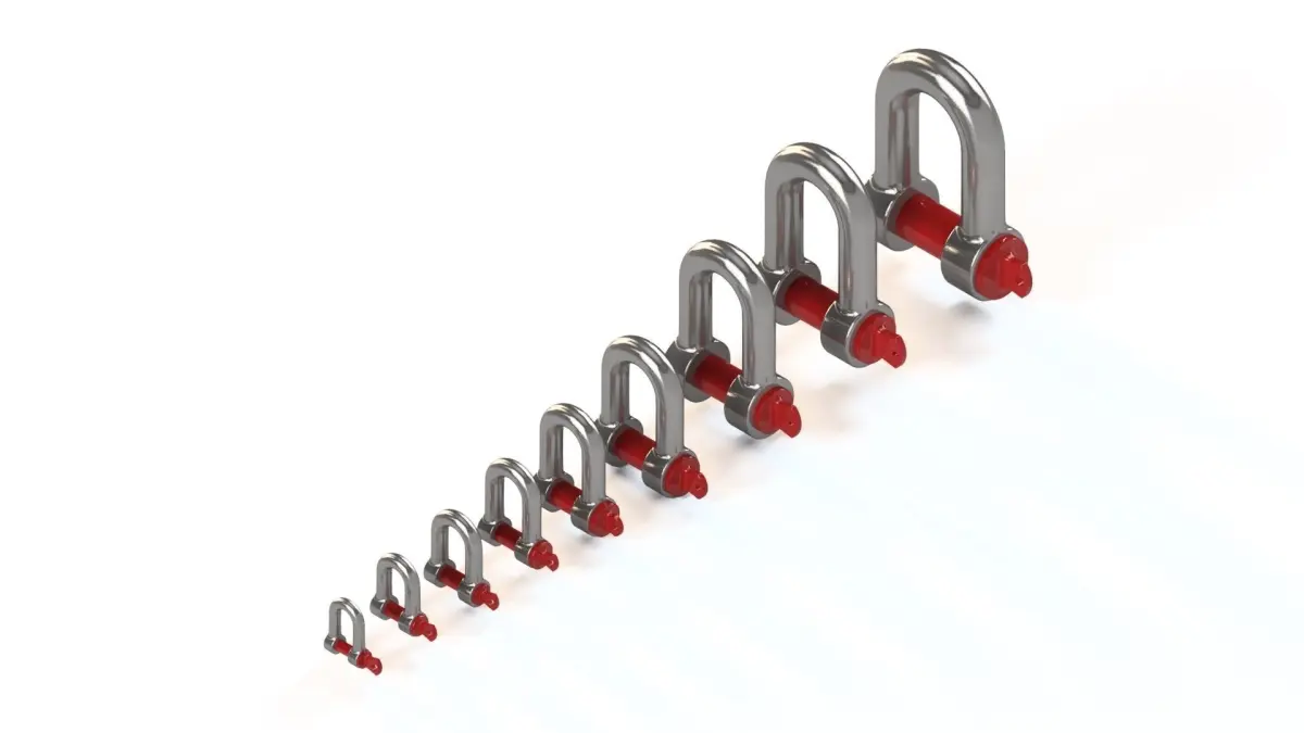 D-Shackles.DIMENSIONS AND LIFTING CAPACITIES:M6: 500 kgM8: 750 kgM10A: 1000 kgM10B: 1500 kgM12: 2000 kgM16: 3250 kgM20: 4750 kgM22: 6500 kgM24: 8500 kg