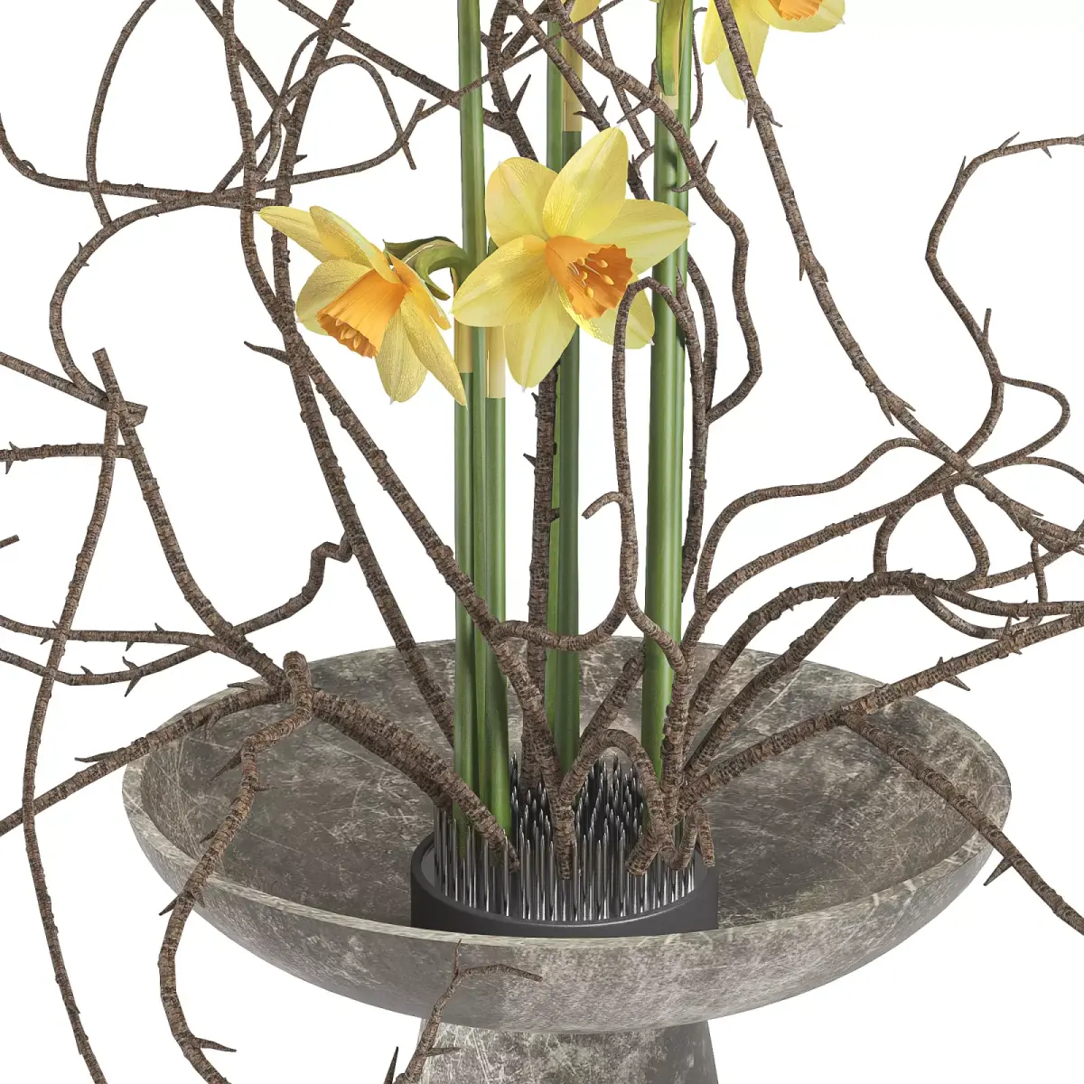 Floral Design: The arrangement features vibrant yellow Daffodils (Narcissus) with detailed trumpets and petals, standing tall on green stems. These are artfully intertwined with gnarly, dry twisted branches, creating a dramatic contrast between fresh blooms and weathered wood.