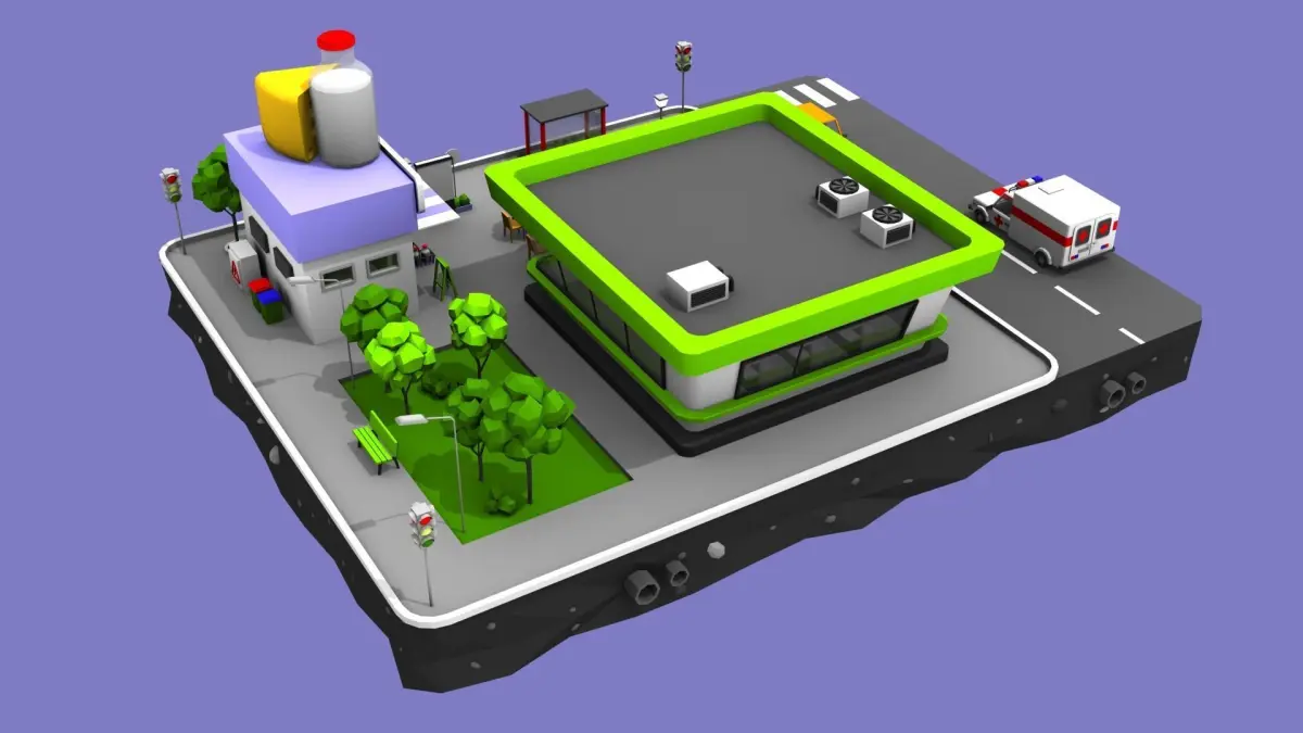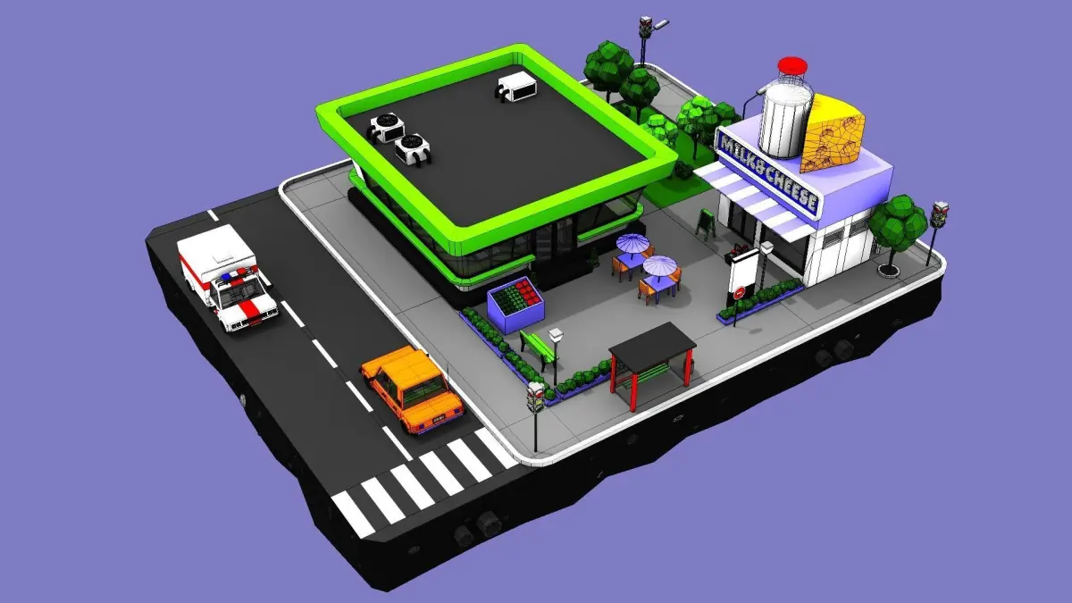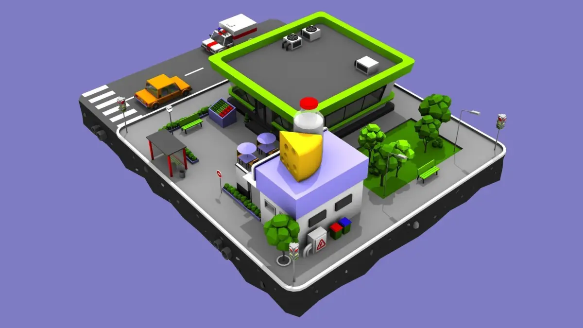 The set includes the part of the ground and street, the Dairy Store and big shop, the grass, some trees, some shrubs and 2 low poly cars - sedan and ambulance car.The model has good level of detail within the minimalist animation style. Correct and simple mesh, made in rectangles and triangles. Despite the high detailing, the model is not heavy and will open even on a weak computer. Also, textures are almost not used in the model - only the license plates on cars have a texture. No additional plugins are used. Easily can be used in animation and games. Rendered in default 3ds Max Scanline Render, preview images rendered with exact light setup in 3ds Max scene.