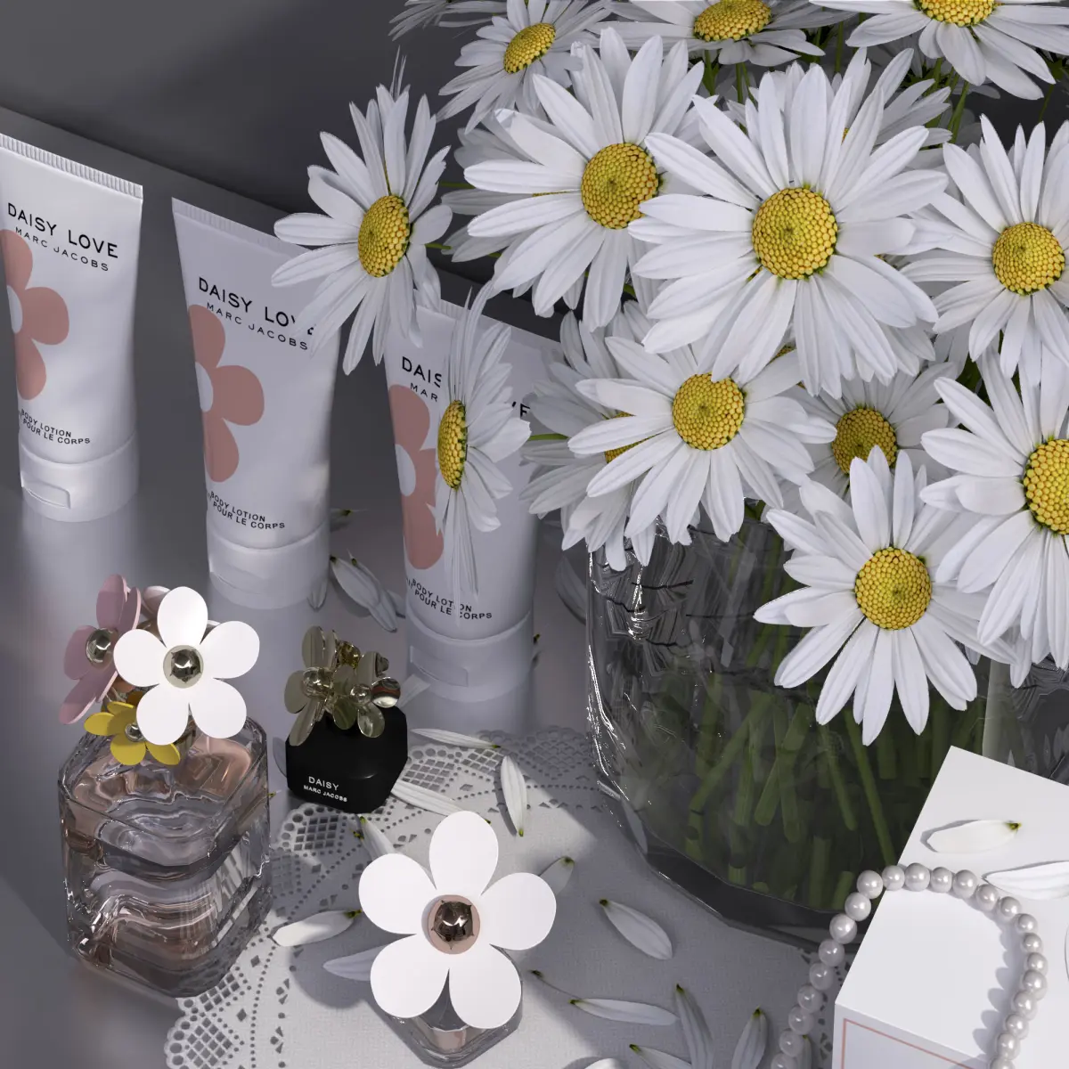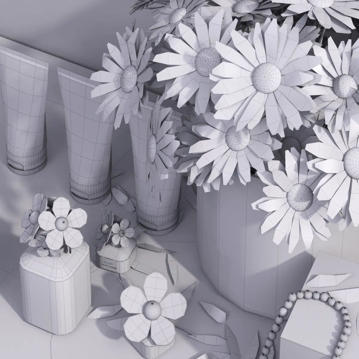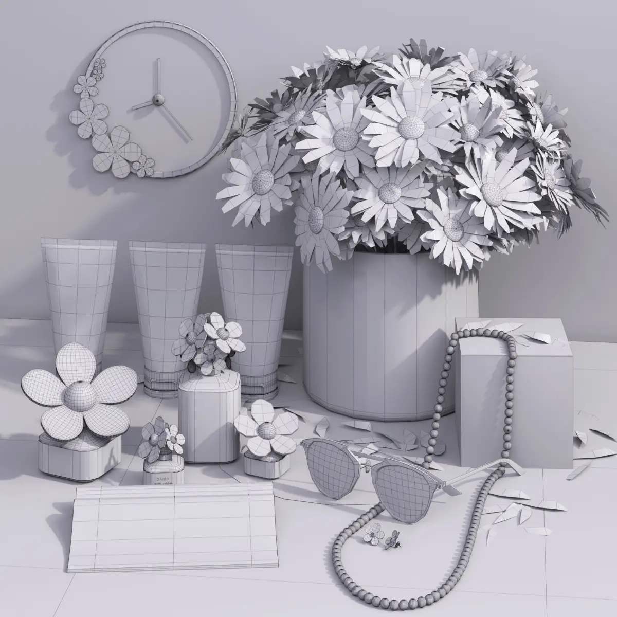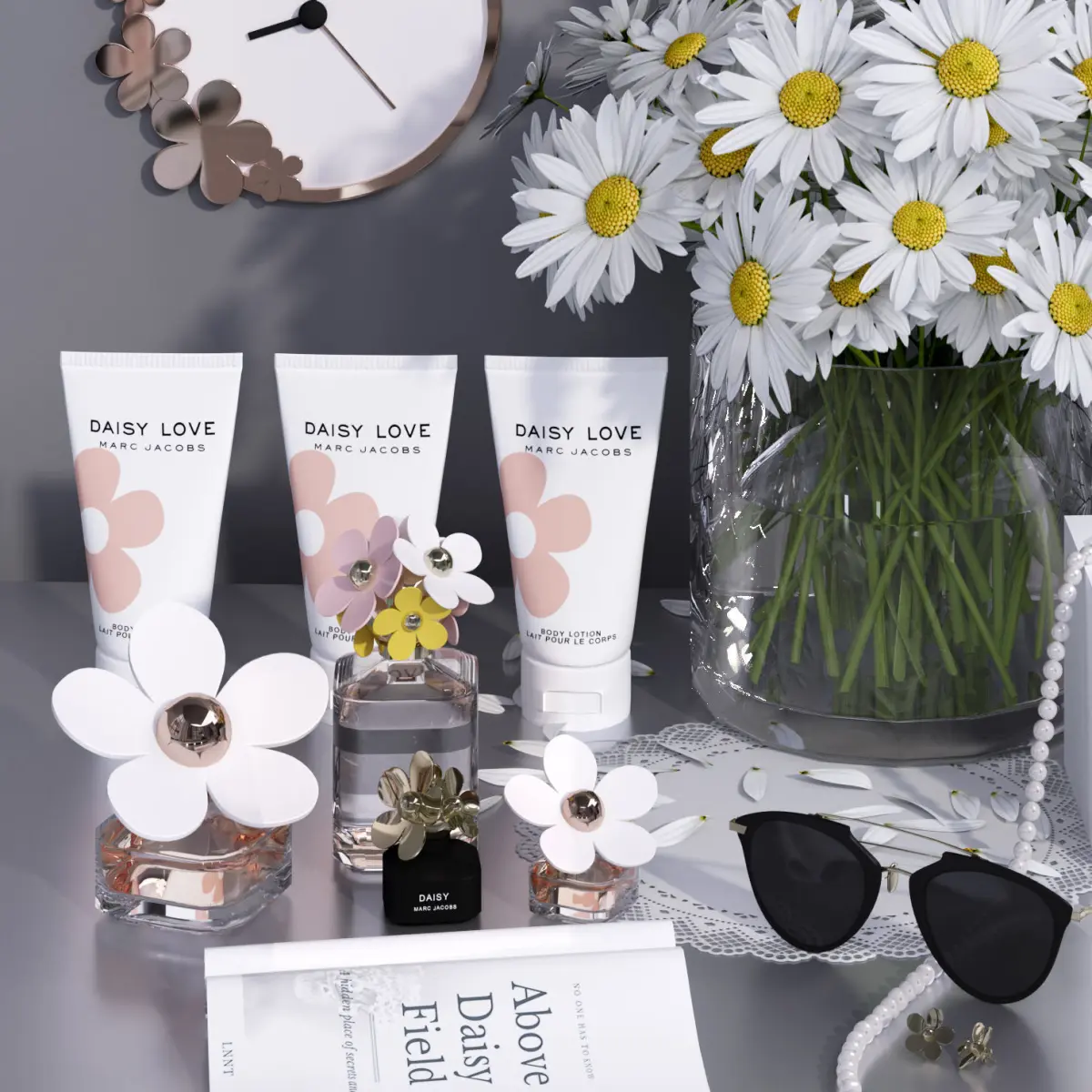 3d model daisy decorative set with brand goods, marc jacobs perfume and lotion, dior sunglasses, clock, coaster, body lotion tubes, daisy glass vase, glasses, decor set , tansy, calendula, health and beauty
