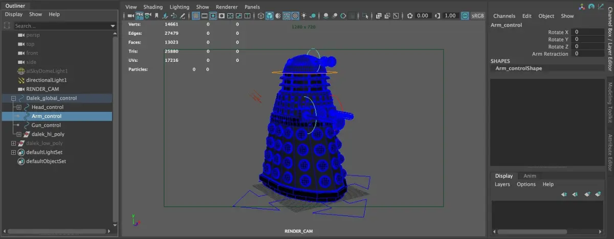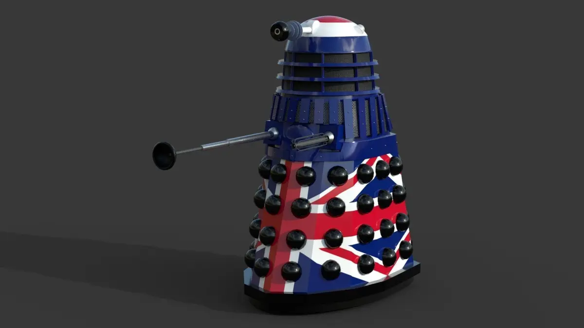 This Maya 2020 rig of a 70’s-era dalek from the Doctor Who TV series has 4K PBR maps set up for rendering in Arnold 5. Two separate Maya rigs are optimized for animating specifically for UE4 and Maya. Two different texture options are included: classic and Union Jack. The rig has controls for the head (rotate), eye stalk (rotate), arm (rotate/telescope) and gun (rotate/extend “flower”) as well as the master scale/translate control. The head indicators can be animated to blink using the Emission channel of its material.Additional FBX files, including a low- and high-poly mesh, can be easily animated either as they are or by adding a simple rig in other 3D apps and attaching the 4K PBR maps.