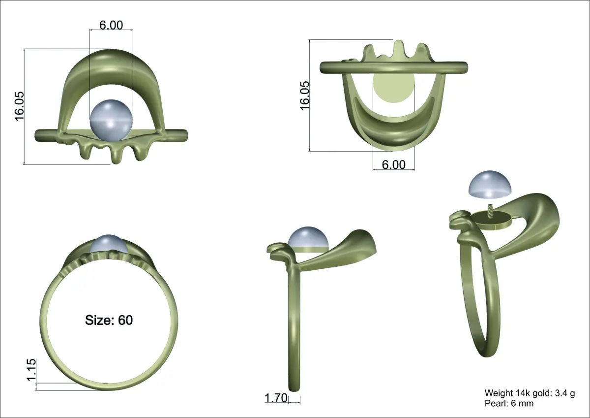 This ring is cast in the shape of an eye, inspired by the symbolic element of the artist Salvador Dalí. 3D copy of original. Pearl: 6 mm. Sizes: 50-60. Original file 3dm has size 60 (19 mm). Ready for printing. File formats: 3dm, stl, obj, ztl.