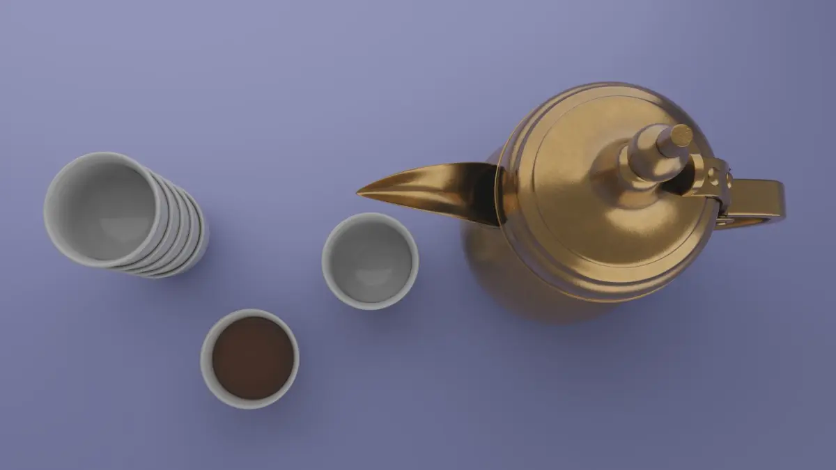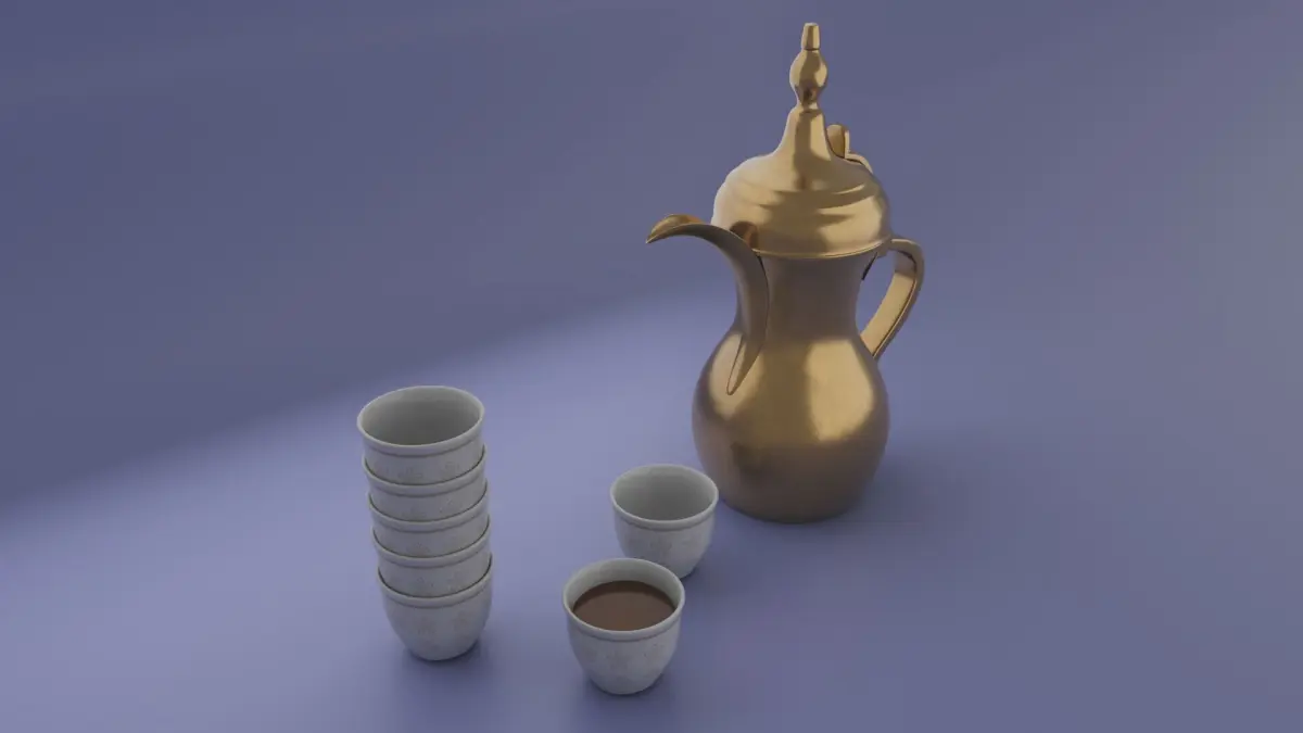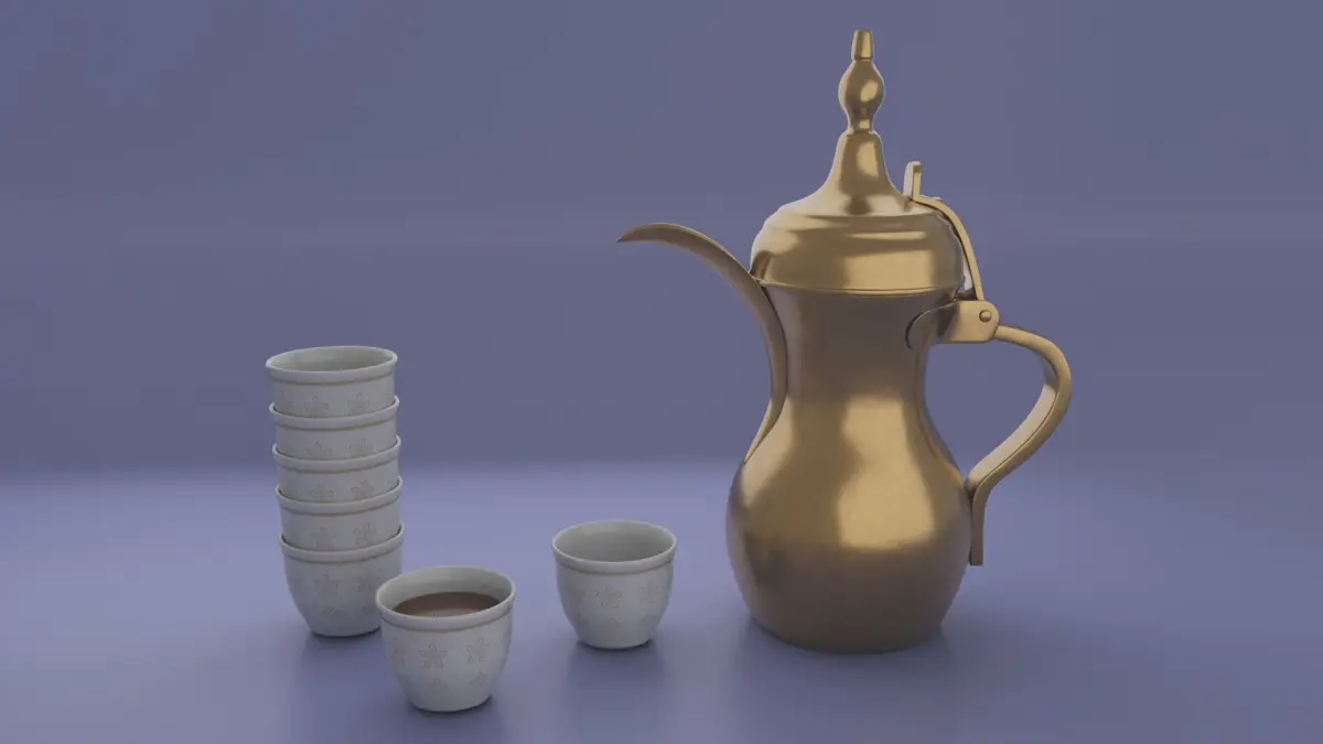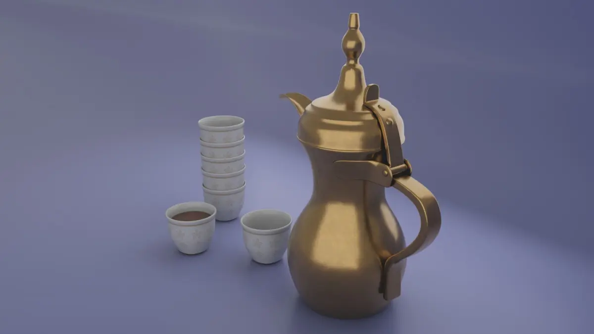 out of sacle 3D model of Dallah golden Arabic coffee pot and Finjan cups