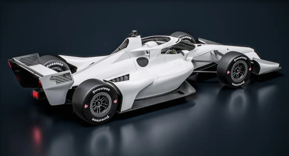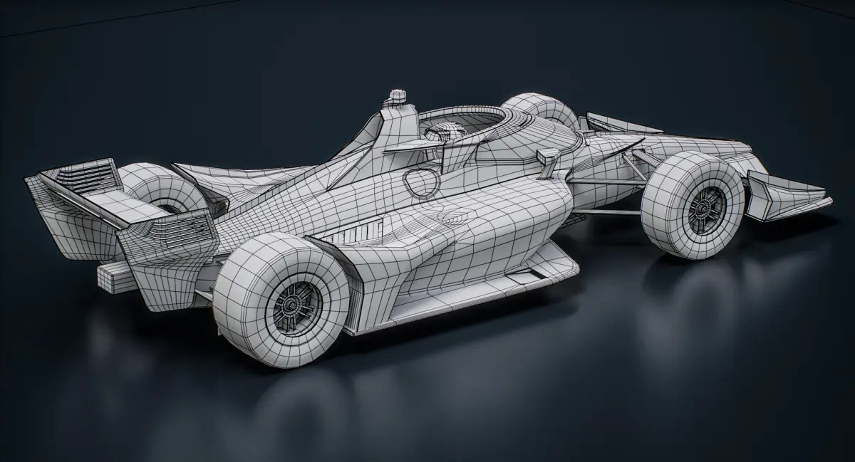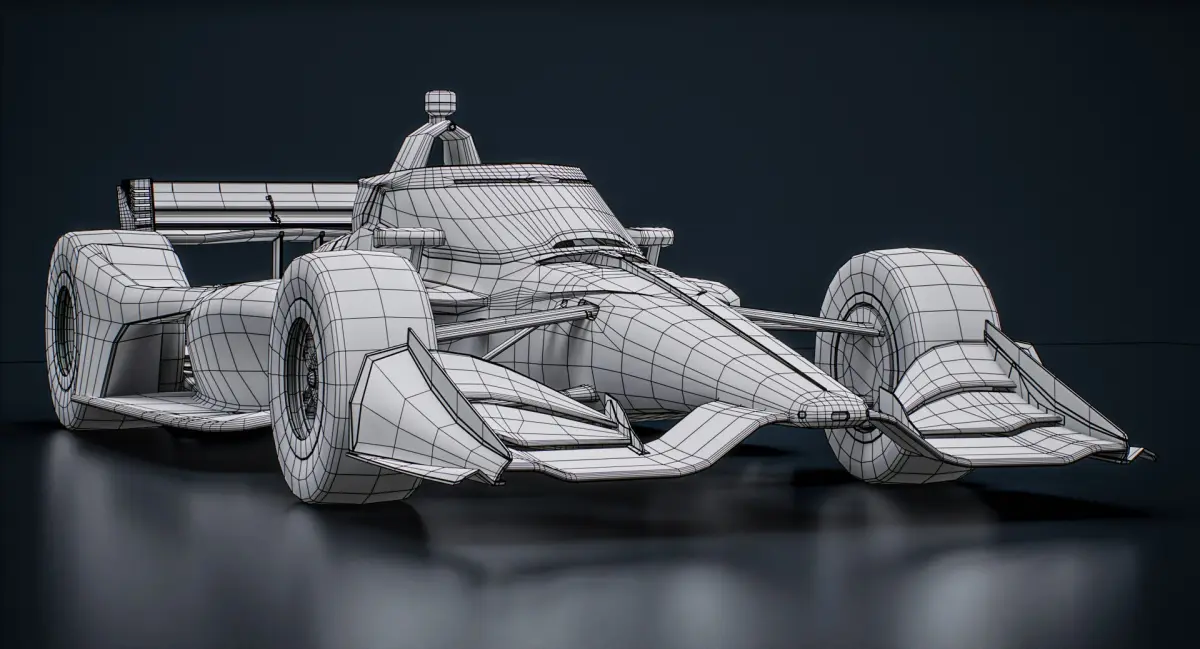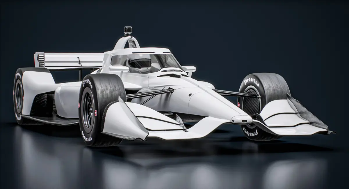 Low-poly game ready 3D model of Dallara DW12 Universal Aero Kit (UAK-18) Race Car with Aeroscreen and PBR materials (Specular and Metallic workflows) white mockup. High Downforce Package. Suitable for computer/mobile games, broadcast, advertising, visualization.
