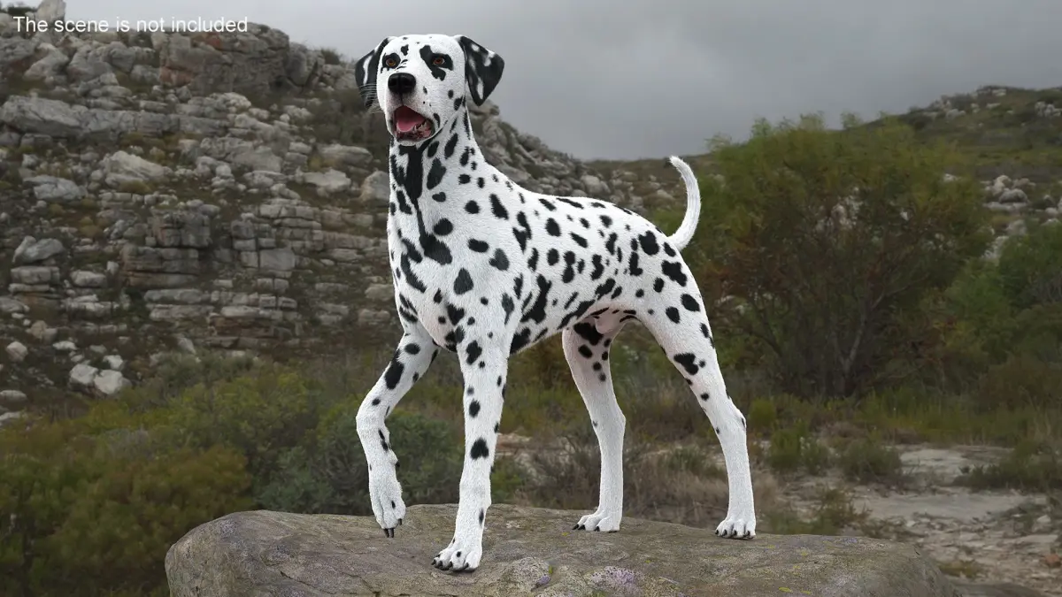 Dalmatian Dog Fur Rigged is a three-dimensional model of Dalmatian dog which is a well known medium-sized breed known for its distinctive black or liver spots on a white coat.