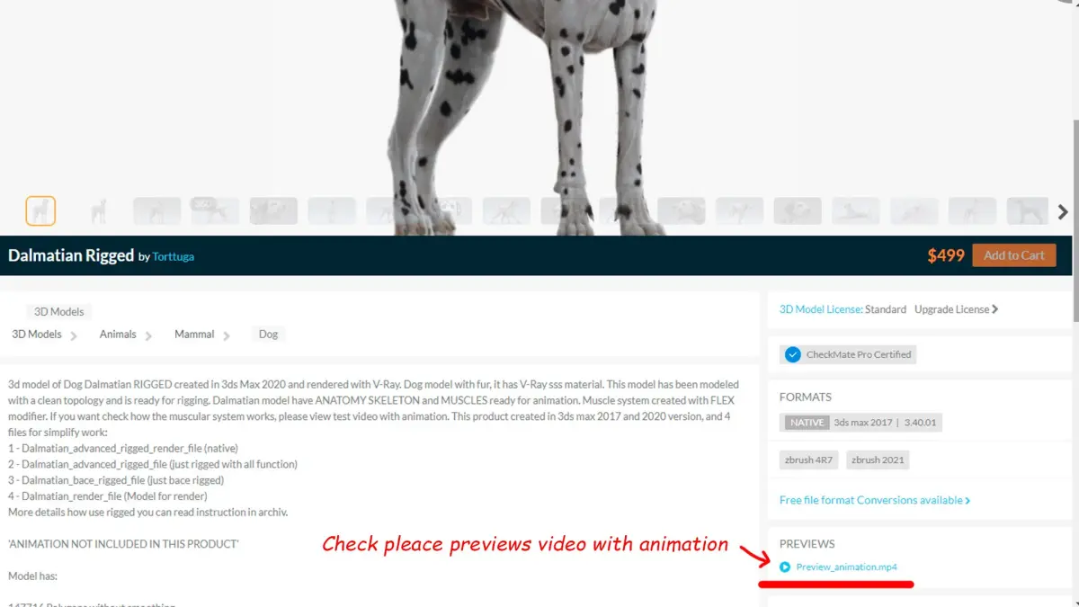 3d model of Dog Dalmatian RIGGED created in 3ds Max 2020 and rendered with V-Ray. Dog model with fur, it has V-Ray sss material. This model has been modeled with a clean topology and is ready for animation. Dalmatian model have ANATOMY SKELETON and MUSCLES ready for animation. Muscle system created with FLEX modifier. If you want check how the muscular system works, please view test video with animation. This product created in 3ds max 2017 and 2020 version, and 4 files for simplify work: