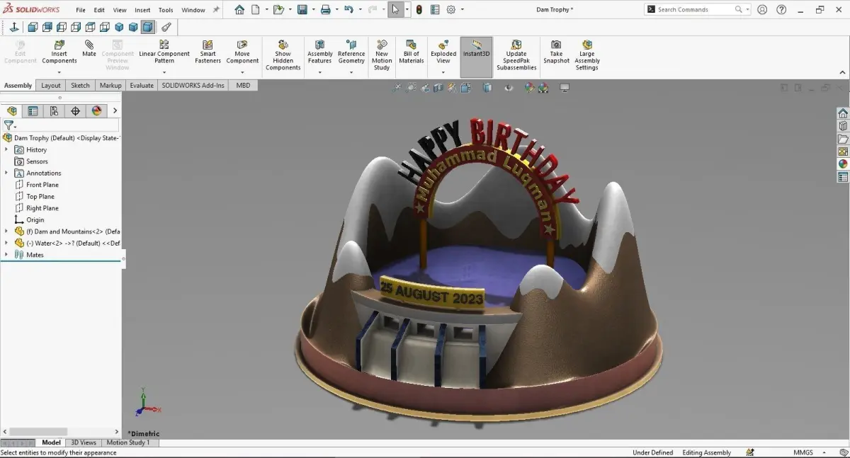 Birthday Cake named as 'Dam Cake' with a dam. The water in the center can be made of an edible jelly thus preventing the fear of flooding once the dam is 'breached' or mountains 'taken down'. The writings on the cake can be easily changed and customized. All you need to do is to send me a message and I will fulfill your requirements and upload the files here.