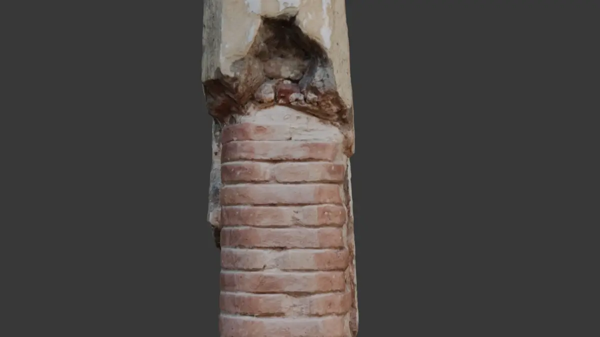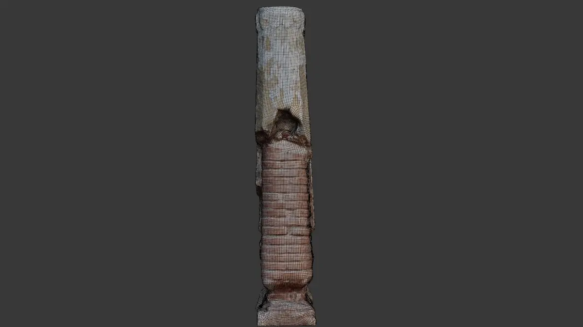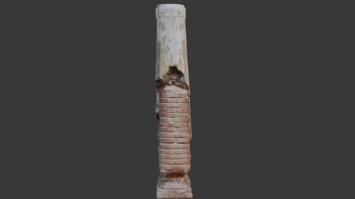 A highly detailed 3D scan of a damaged antique column with exposed brick and a weathered plaster finish. This model is perfect for historical reconstructions, architectural visualizations, game environments, and film production. The scan captures realistic textures and structural decay, making it ideal for realistic scenes and ruins.