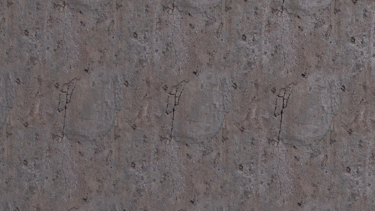 This damaged concrete ground texture features large fracture lines, surface pitting, and rough erosion marks, making it perfect for decayed infrastructure, abandoned roads, war zones, or industrial ruins. Its subtle material breakdown and variation in texture density make it especially useful for architectural visualization and urban environment detailing.